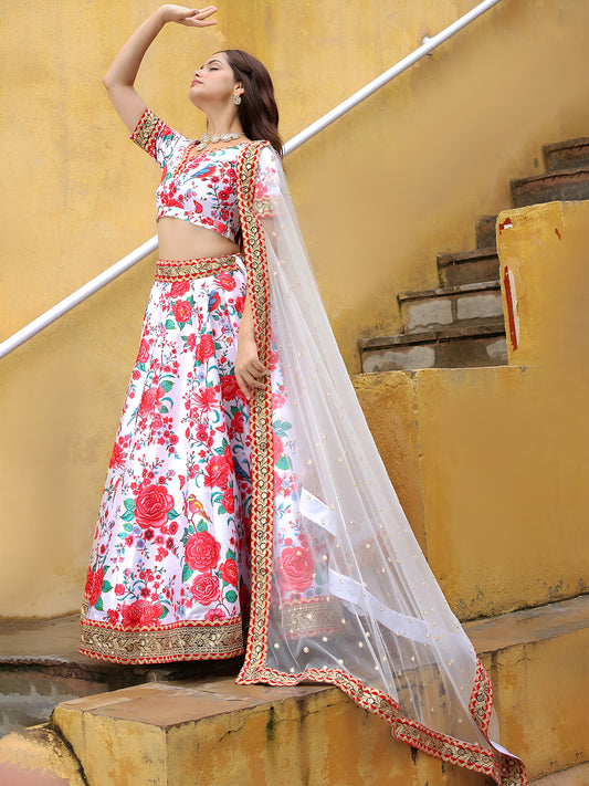 White Floral Printed Lehenga Set with Embroidered Dupatta