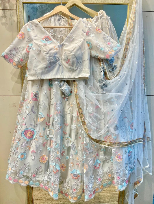 Elegant White Net Embroidered Lehenga Choli with Colorful Floral Detailing – Festive & Wedding Wear