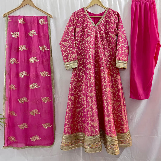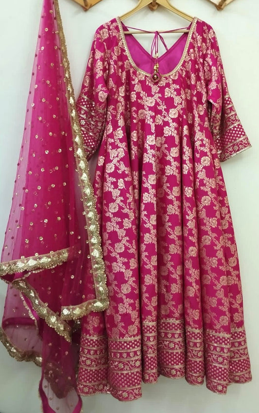 Pink anarkali salwar kameez suit designed with embroidered tissue fabric