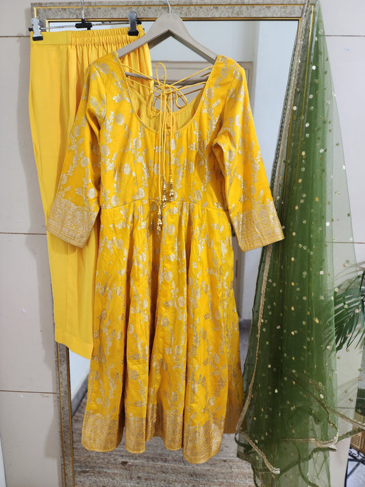 Yellow Anarkali Salwar Kameez with Green Net Dupatta