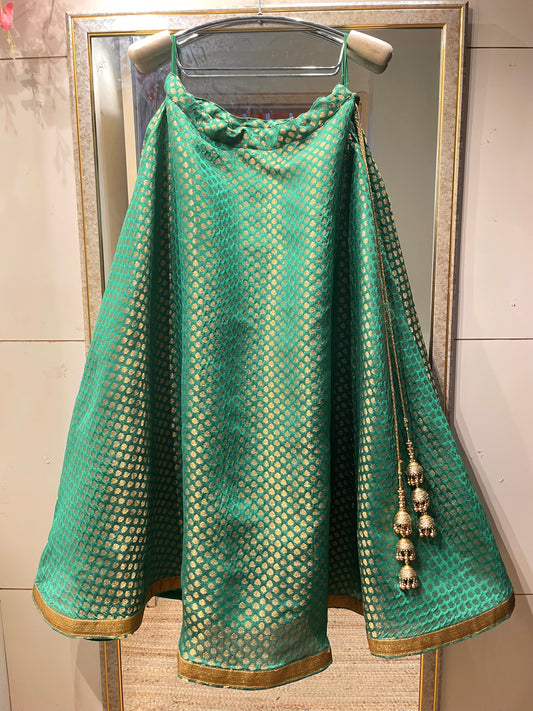 Green Brocade Lehenga Skirt with Golden Zari Work – Custom Size