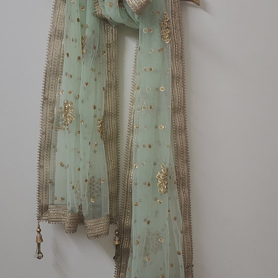 Expertly crafted and delicately embellished, this Mint Green Designer Dupatta is a must-have for any woman's wardrobe. Adorned with intricate embroidery, it provides a touch of elegance to any outfit. Indulge in this ideal accessory and elevate your fashion game.