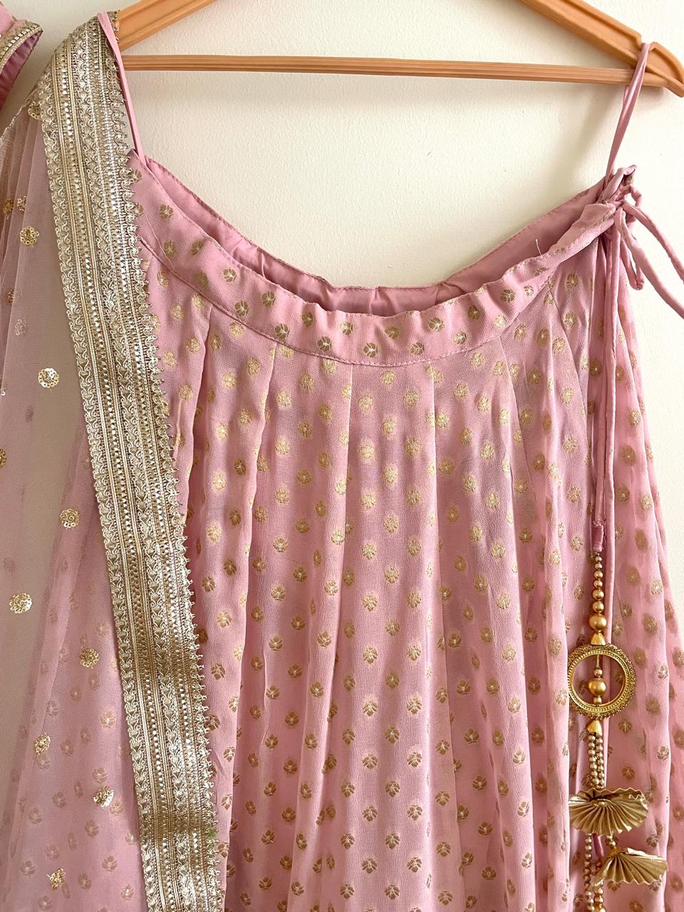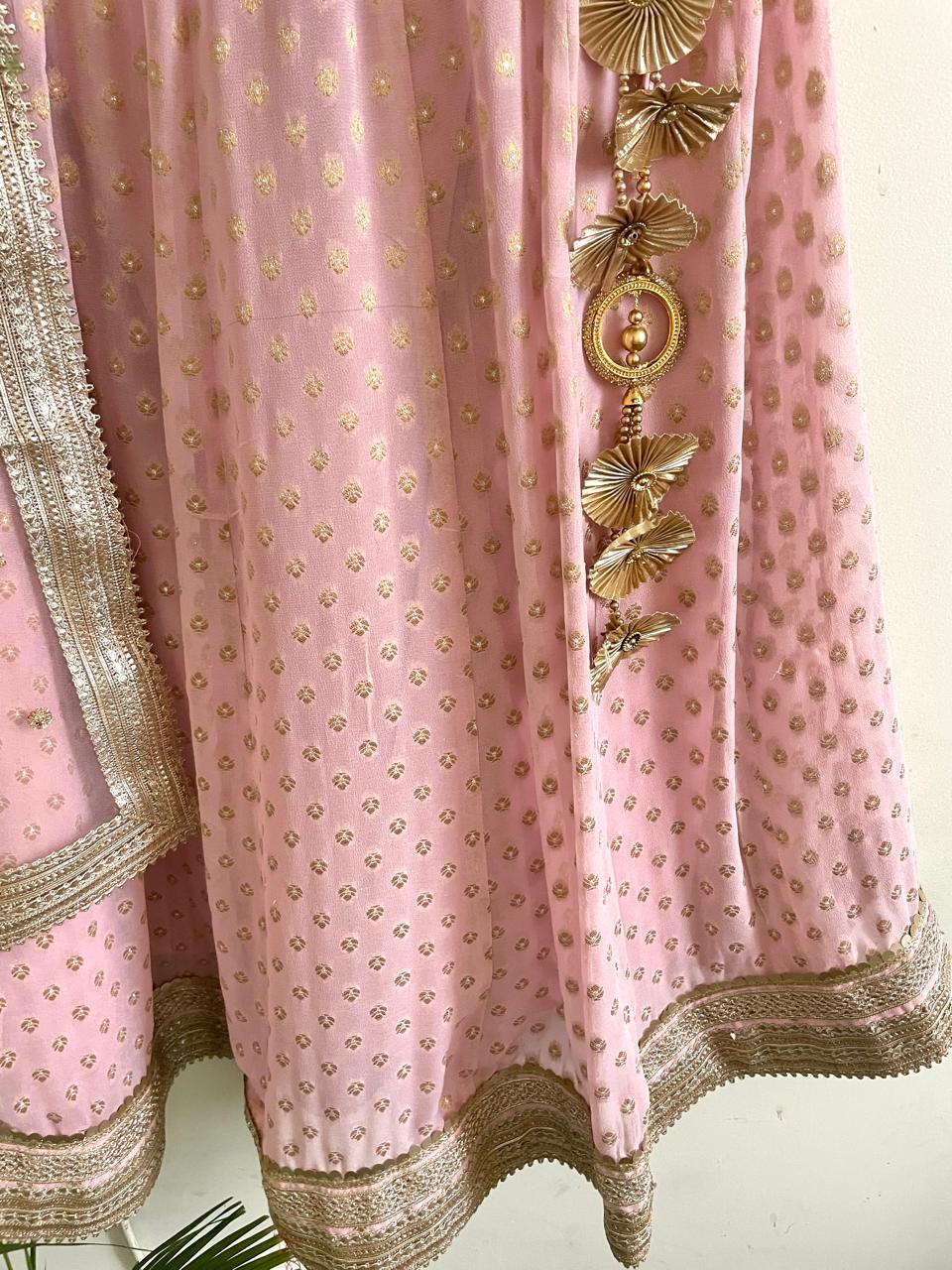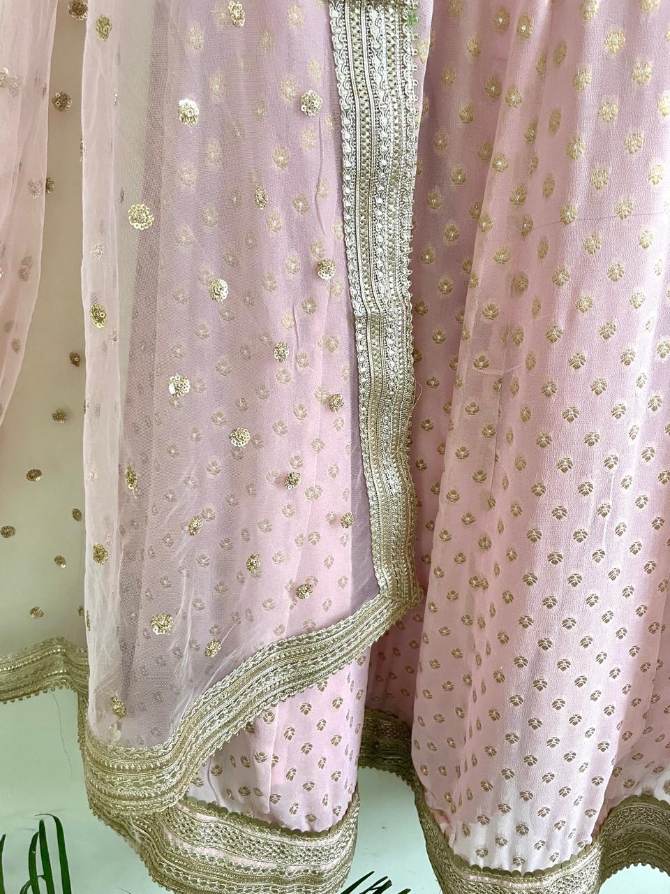Fabric/Material: Flowing silhouette (likely Georgette/Net blend); Sheer Net (Dupatta).