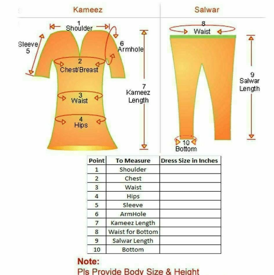 *Size: This is custom made outfit as per your size. Post your order we will send you a measurements reference sheet using which you can provide details required to make your outfit with best fit.