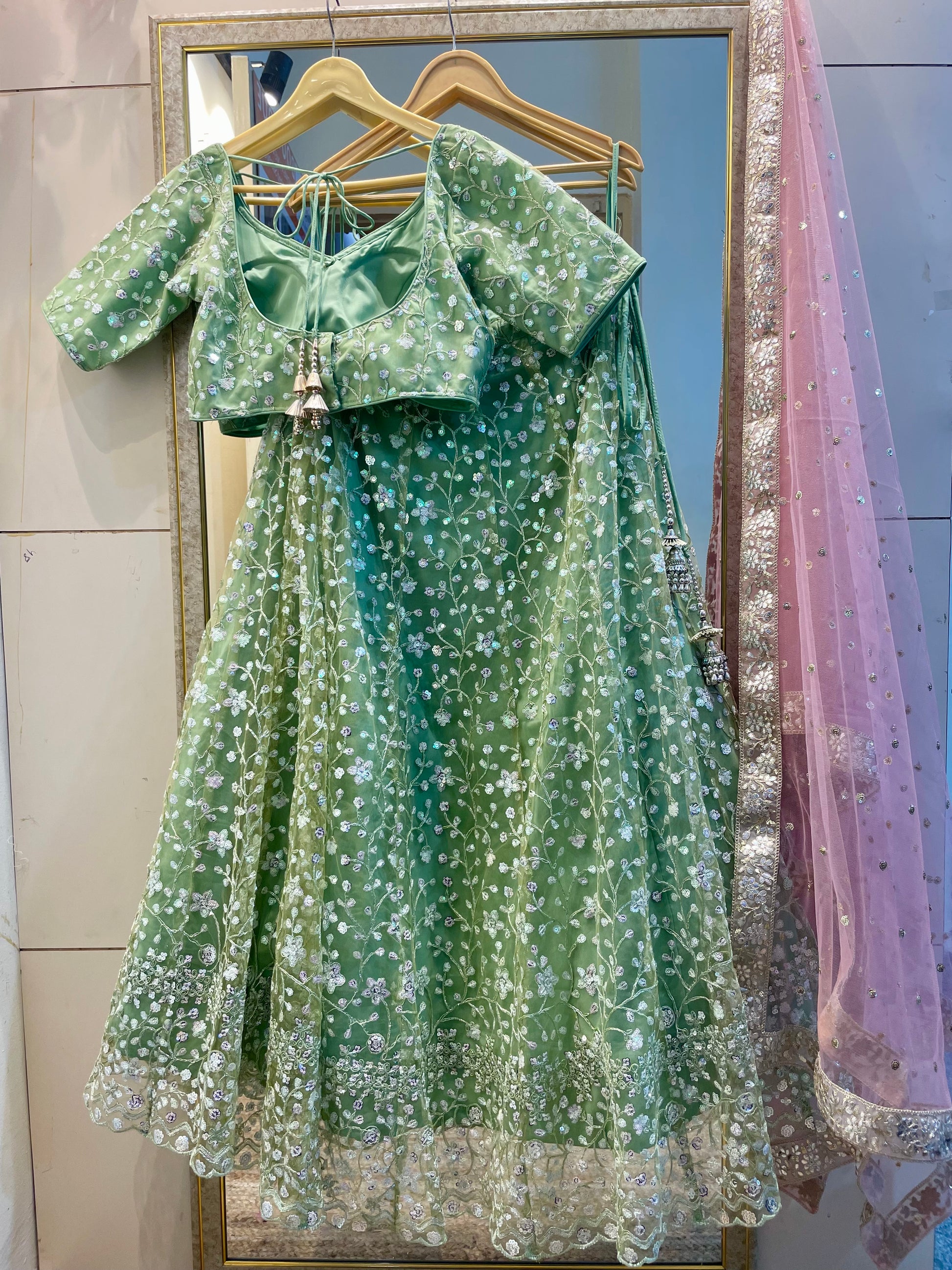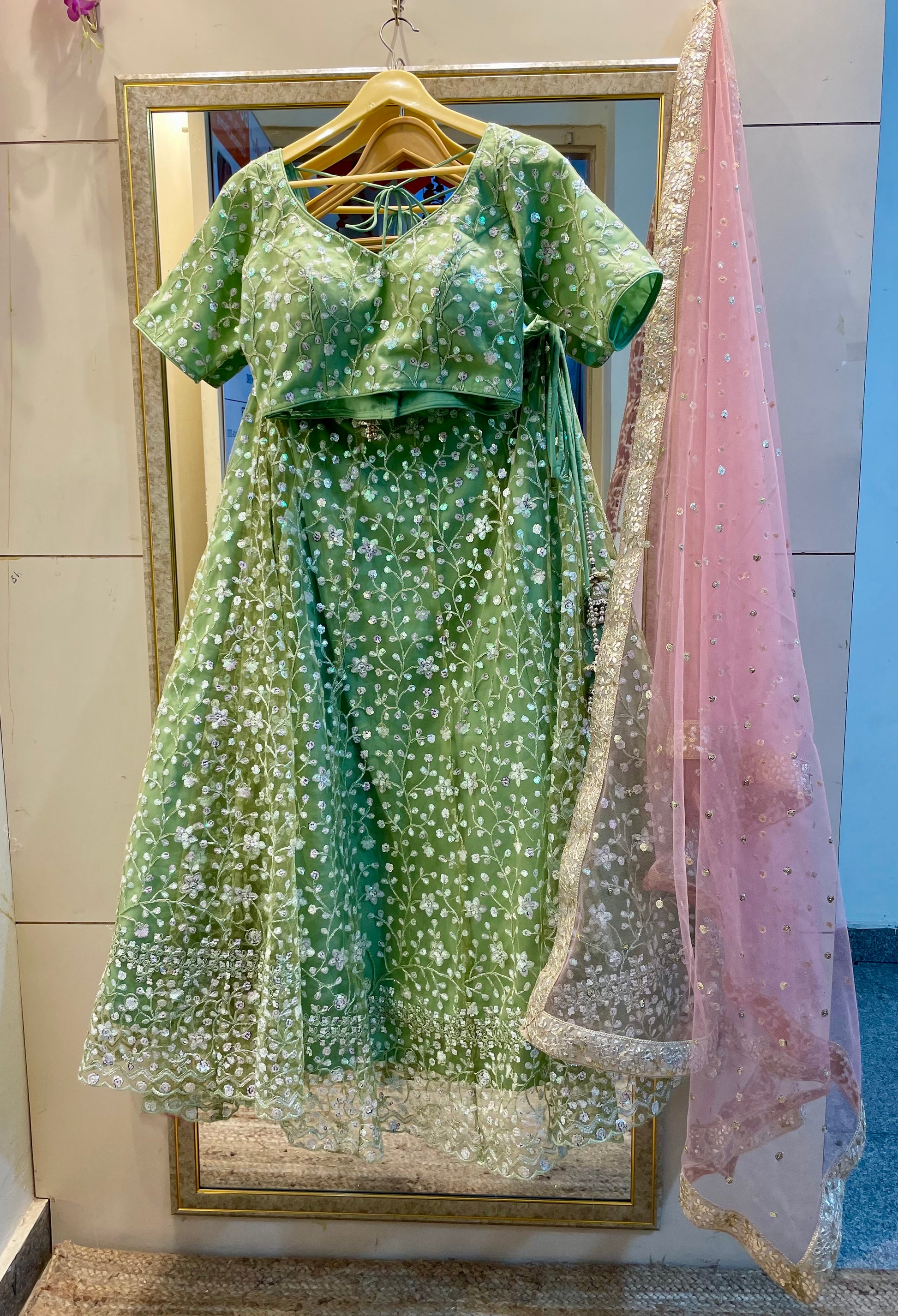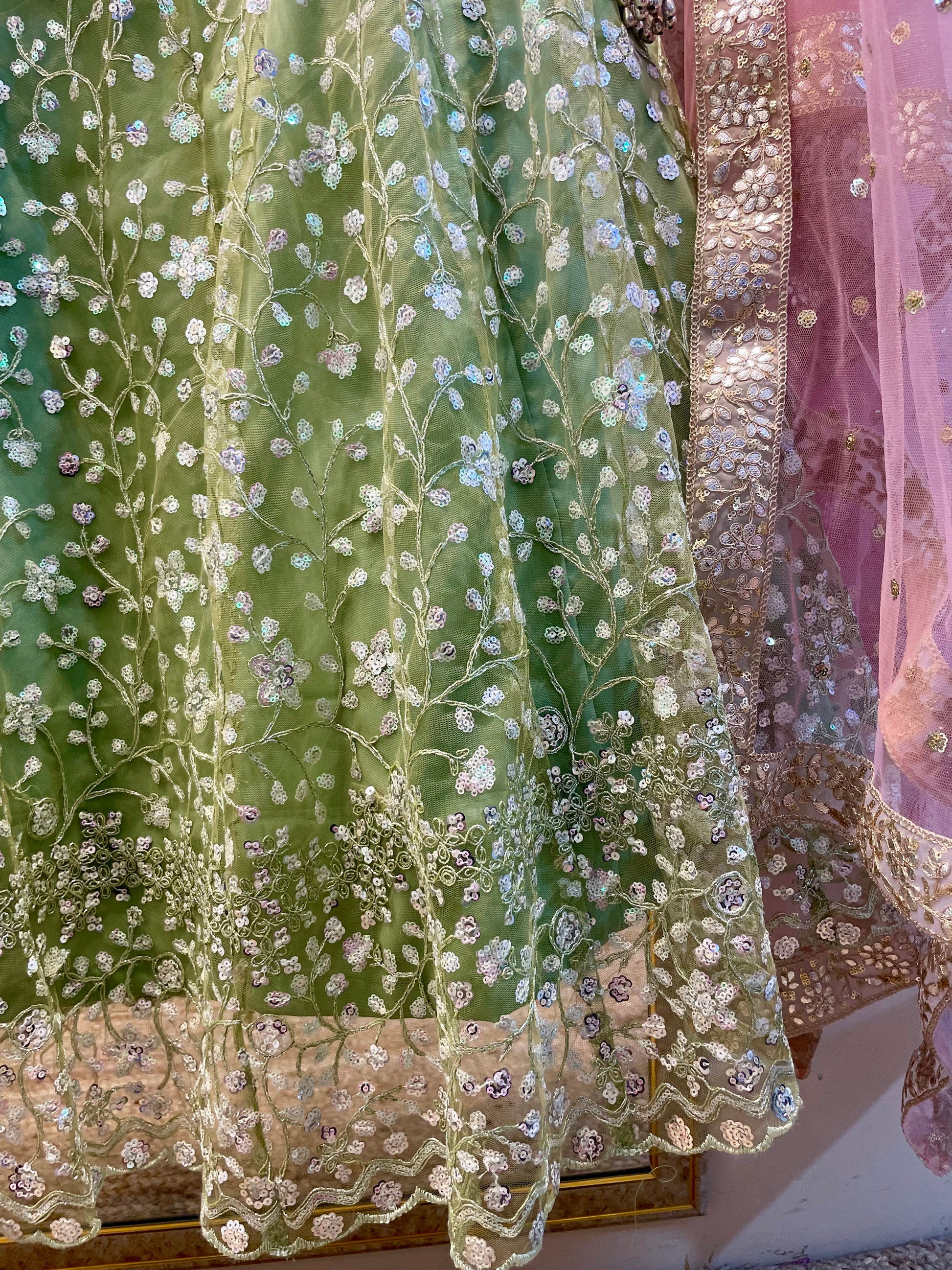 This Indian Designer Embroidered Green Net Lehenga Choli is a stunning piece, perfect for any special occasion. The intricate embroidery on the green net fabric adds a touch of elegance, while the addition of a pink dupatta completes the look. Stand out in this beautiful ensemble and make a statement at your next event.