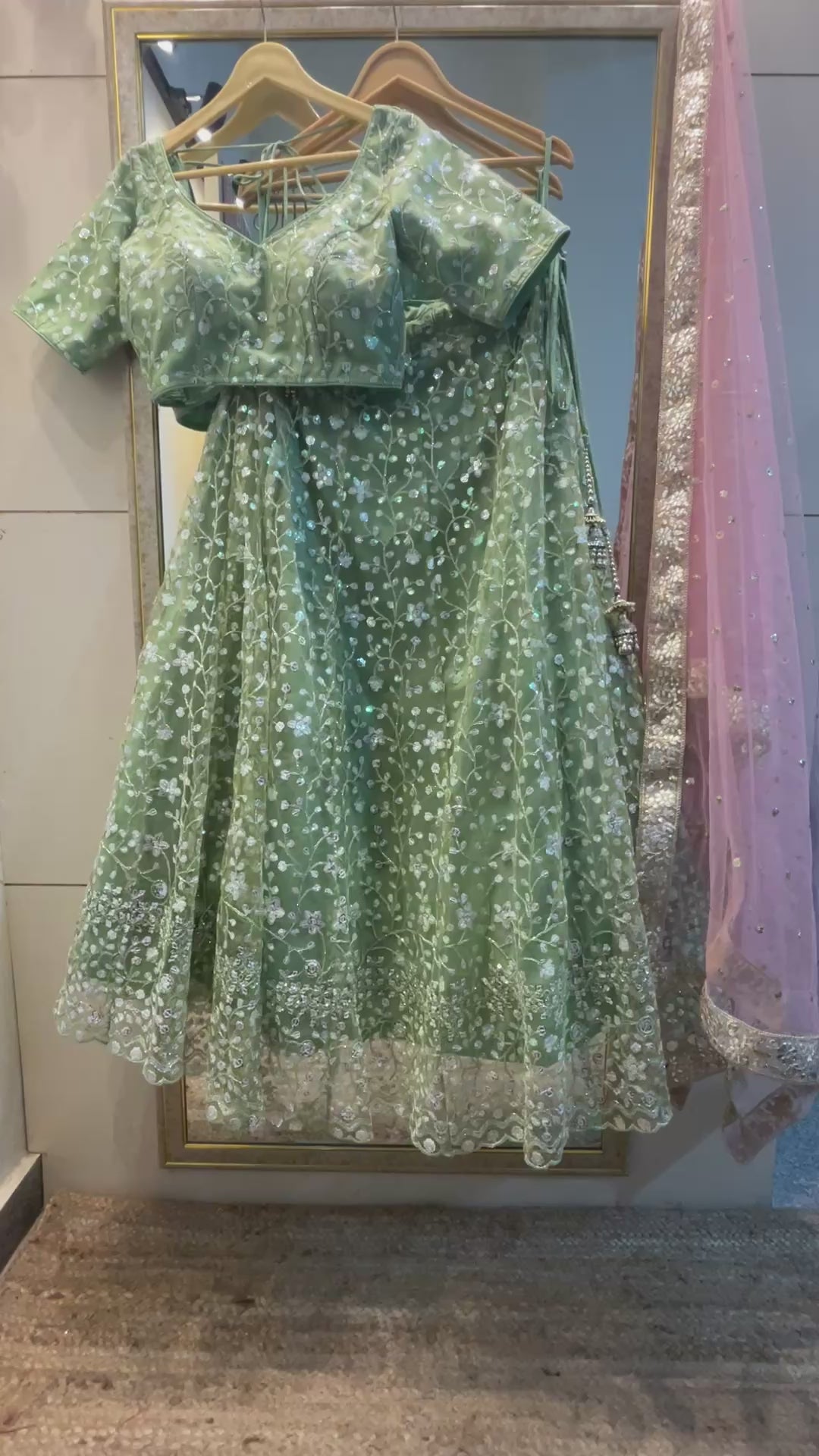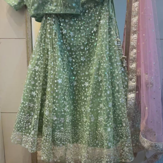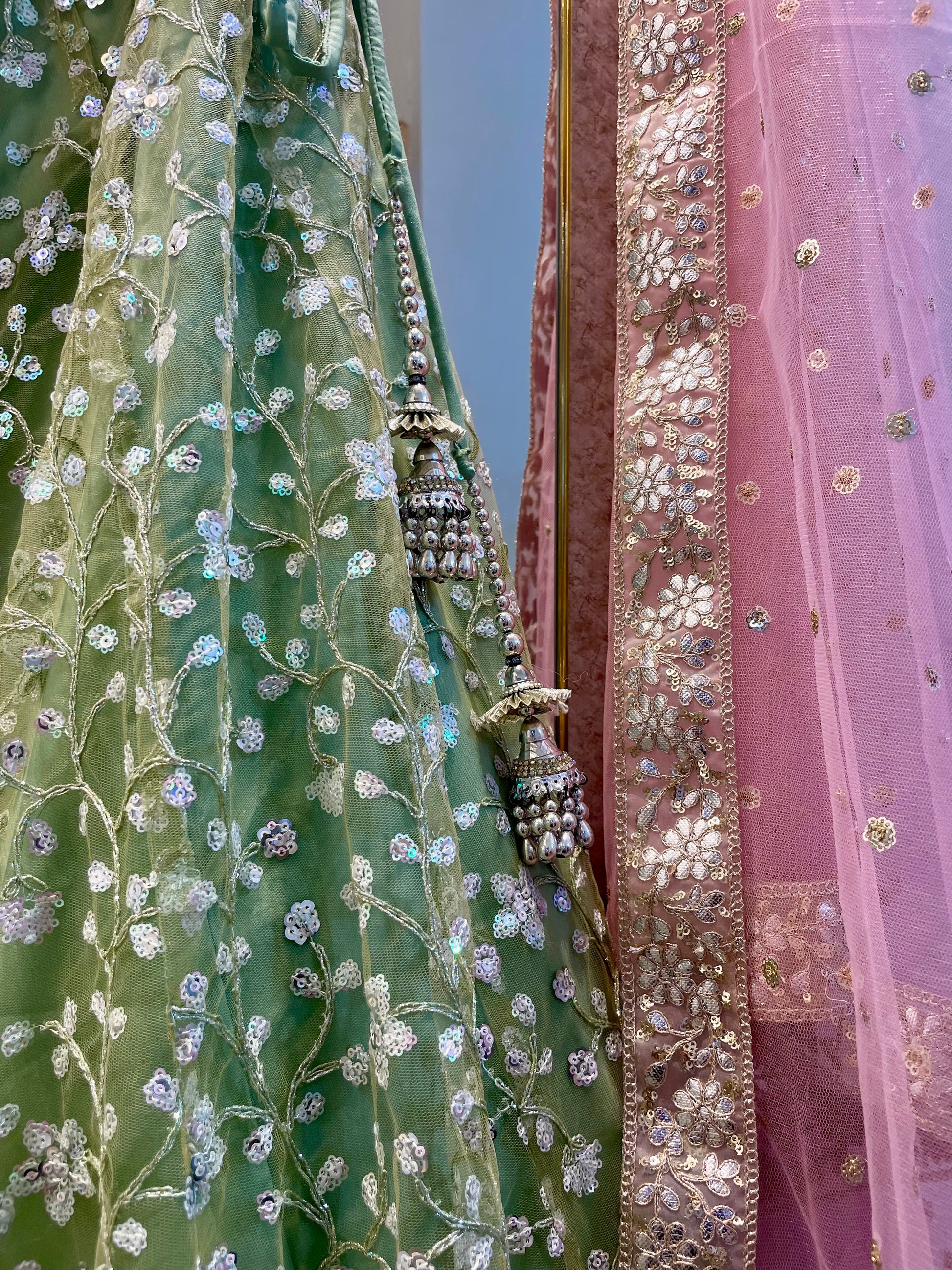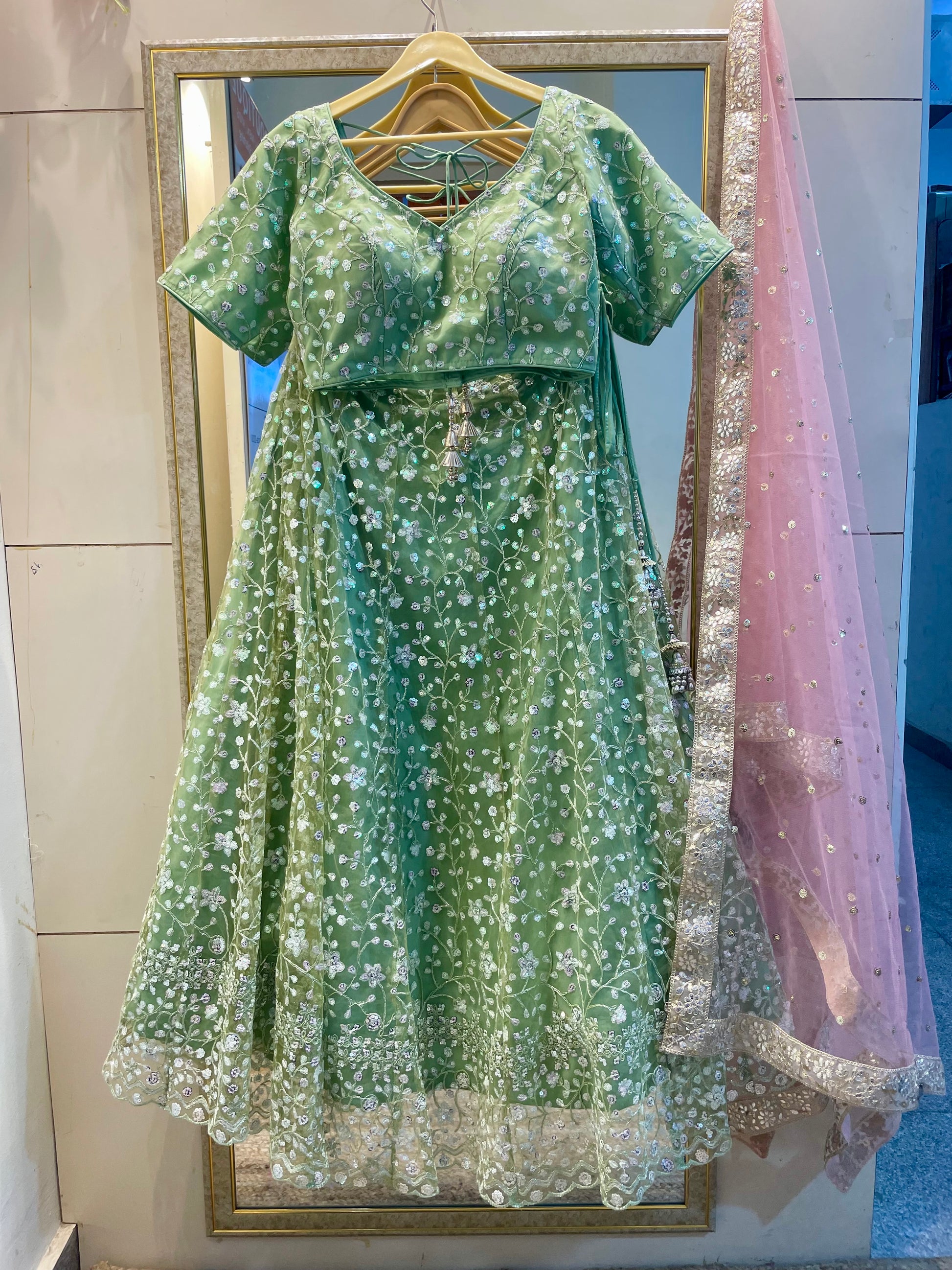 This Indian Designer Embroidered Green Net Lehenga Choli is a stunning piece, perfect for any special occasion. The intricate embroidery on the green net fabric adds a touch of elegance, while the addition of a pink dupatta completes the look. Stand out in this beautiful ensemble and make a statement at your next event.