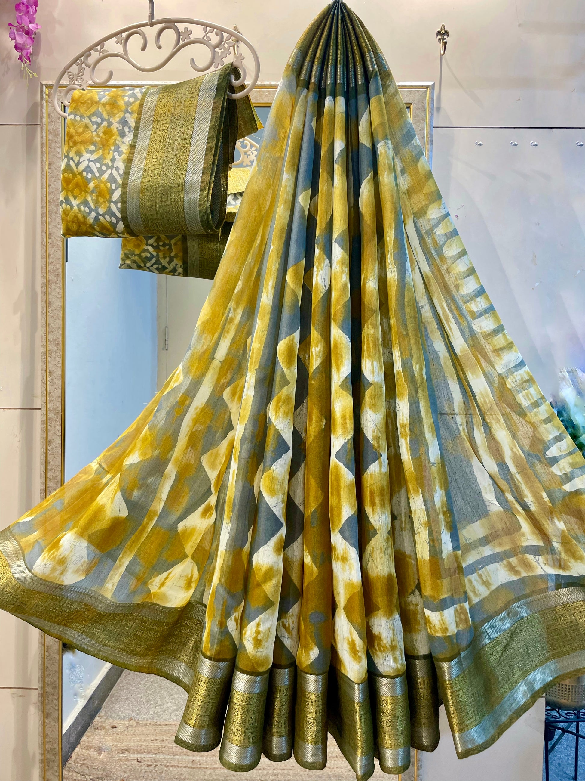 This luxurious cotton linen saree for women features a beautiful yellow and grey color combination that exudes elegance and sophistication. Made of high-quality fabric, this saree offers excellent comfort and breathability, making it perfect for any occasion. Add this statement piece to your wardrobe for a stylish and comfortable look.