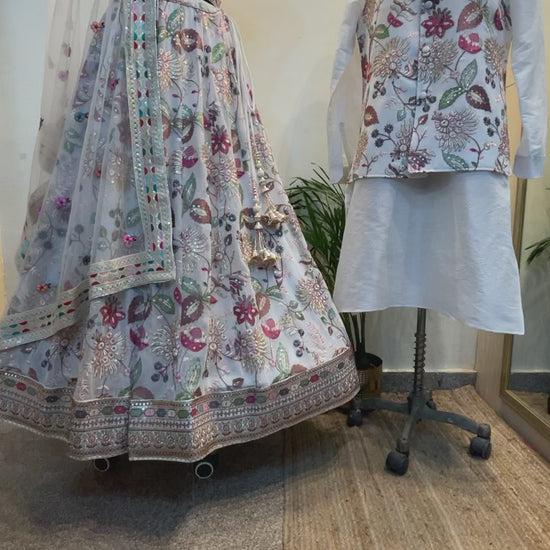 Elevate your wedding attire with our Couple Dress Lehenga with Jacket for Men. This stylish white embroidered lehenga pairs perfectly with a men's kurta, creating a sleek and sophisticated look for any wedding party. Make a statement with this unique and elegant couple dress.