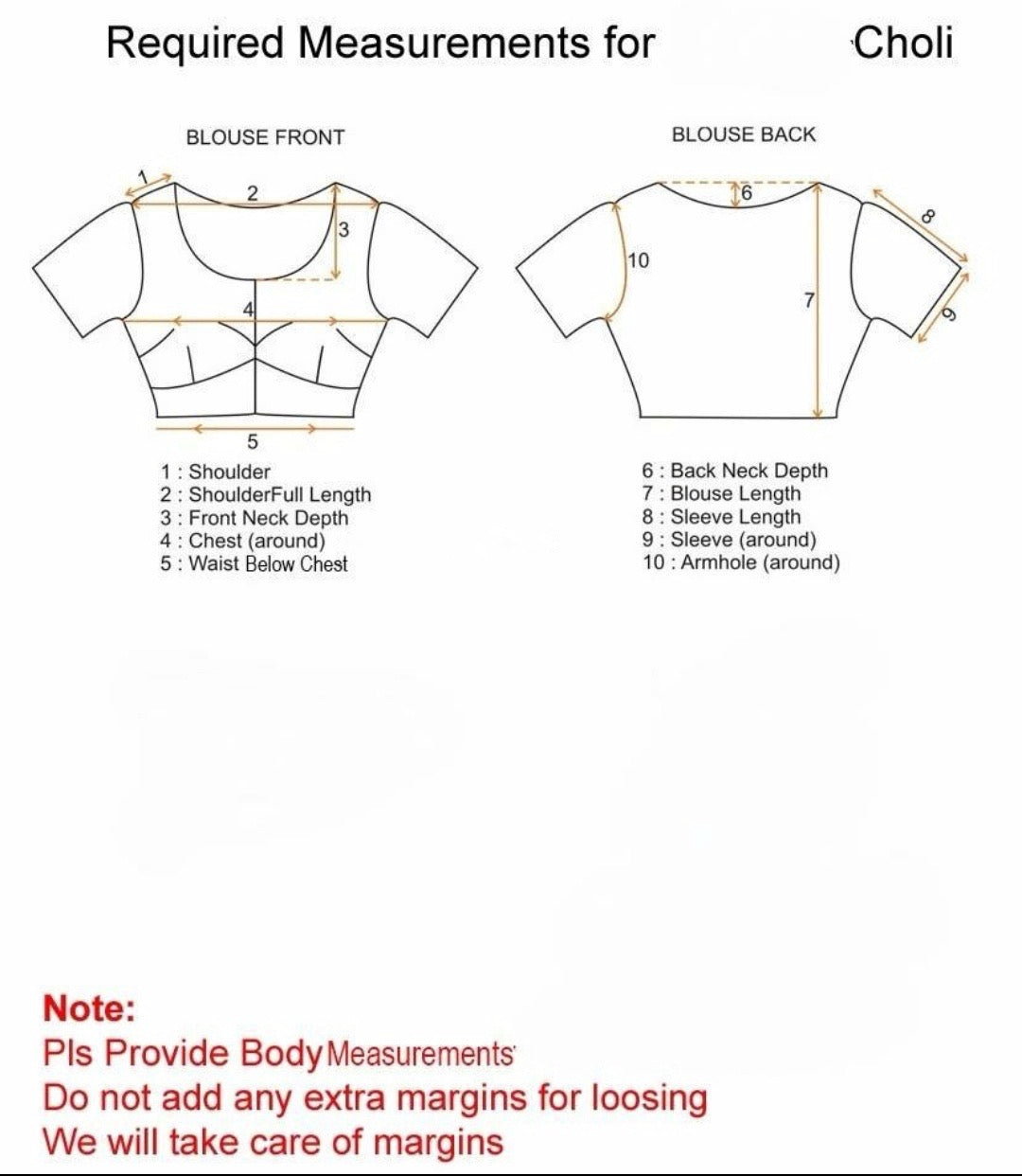 Size: There is an image attached to provide blouse custom sizes. You can send by message or add to order special instructions.