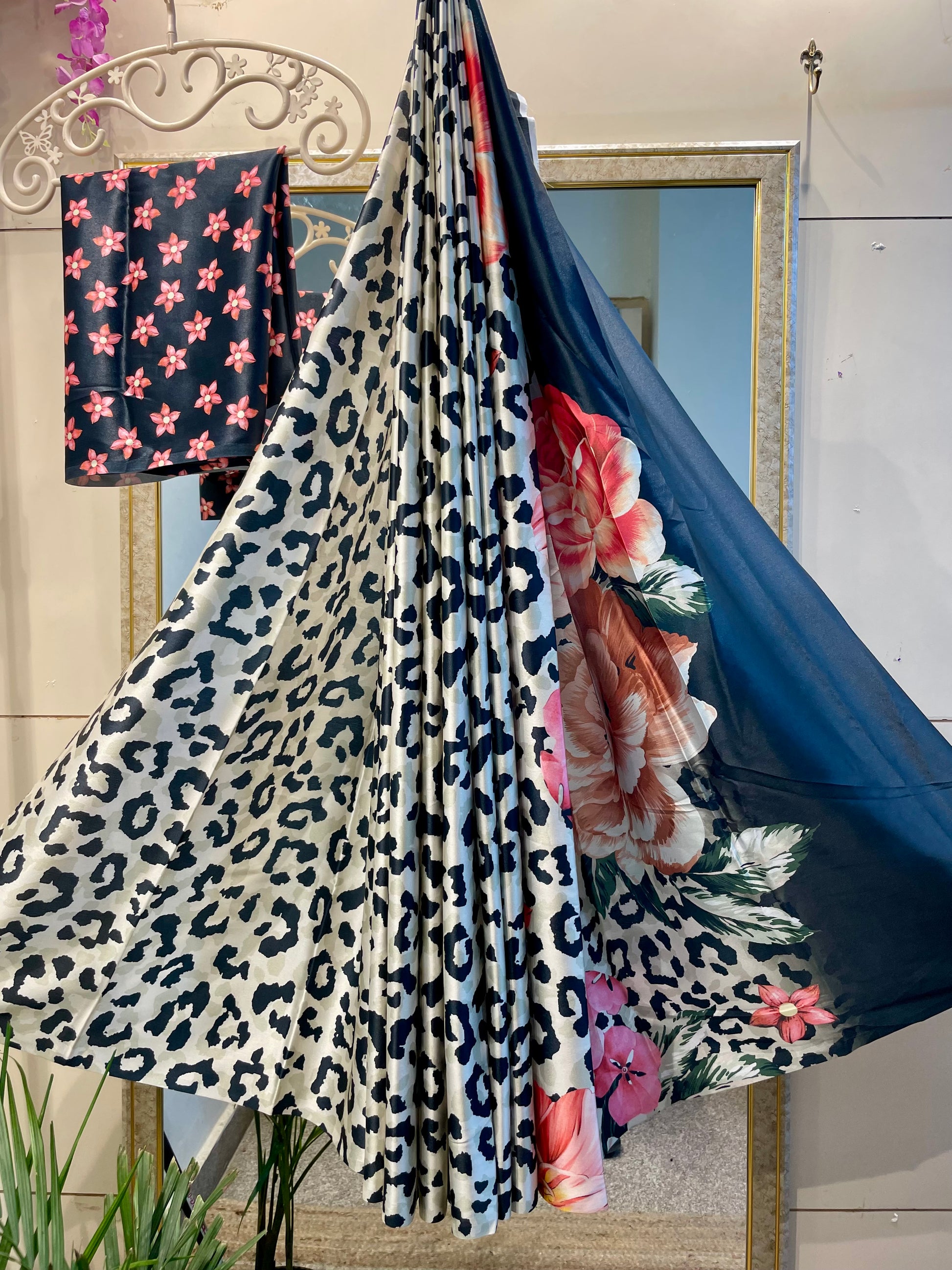 Introducing the Digital printed satin silk saree, featuring a stunning digital floral print on luxurious satin silk fabric. This saree offers a 25% increase in vibrancy and color retention compared to traditional printing methods. Elevate your style with this statement piece.