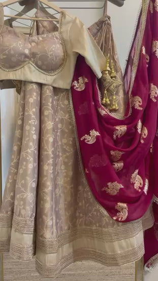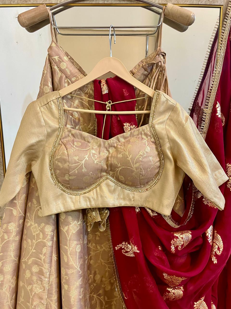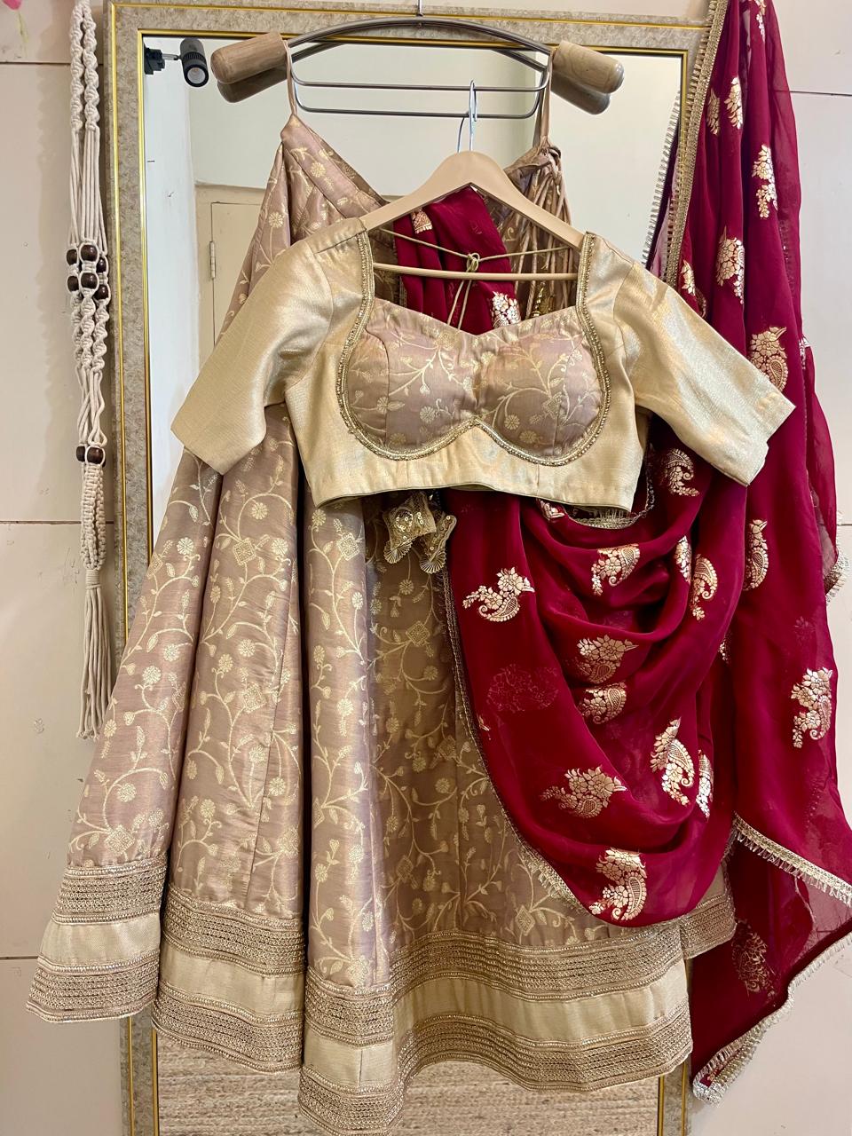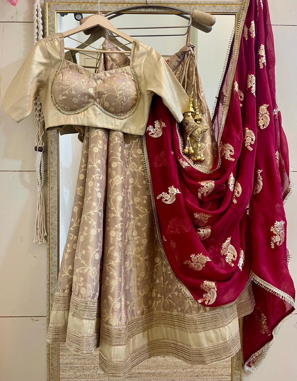 Fabric: Raw Silk (Blouse), Brocade (Lehenga), and Chiffon (Dupatta).