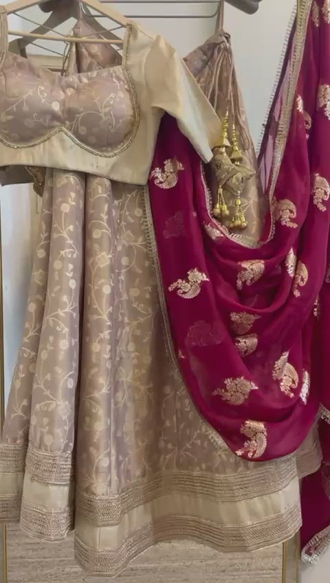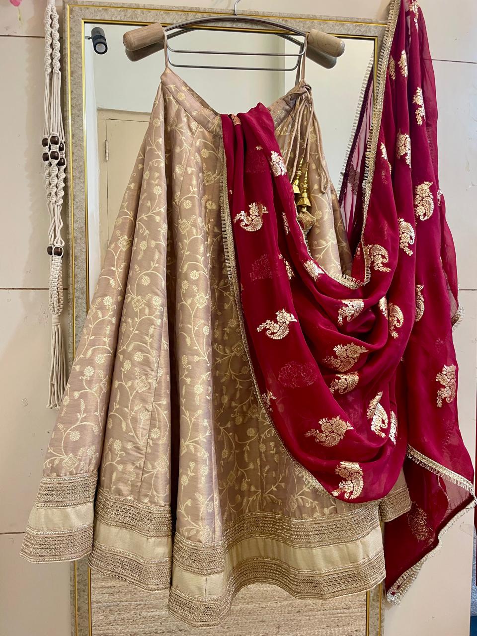 Elegant Beige & Maroon Embroidered Lehenga Set