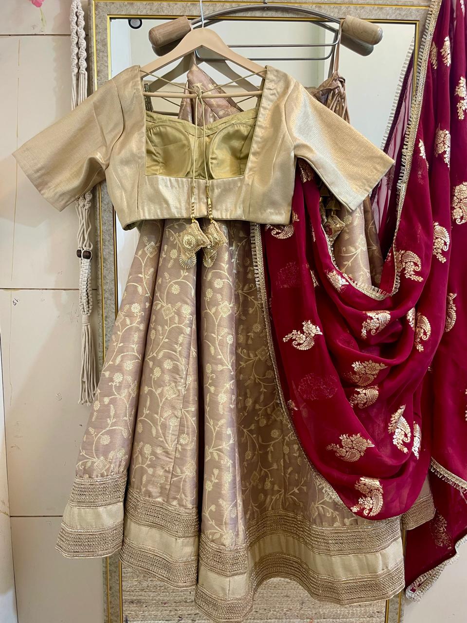 Colour: Beige (Lehenga), Gold-toned (Blouse), and Rich Maroon (Dupatta).