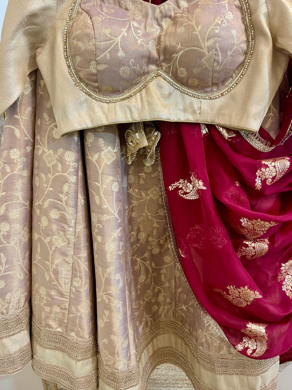 Work:Blouse: Blouse: Mirror-work detailing, structured fit, and tie-up back.Lehenga: Intricate floral zari embroidery (gold threadwork), and a broad embroidered border.Dupatta: Gold paisley embroidery and a delicate lace trim.