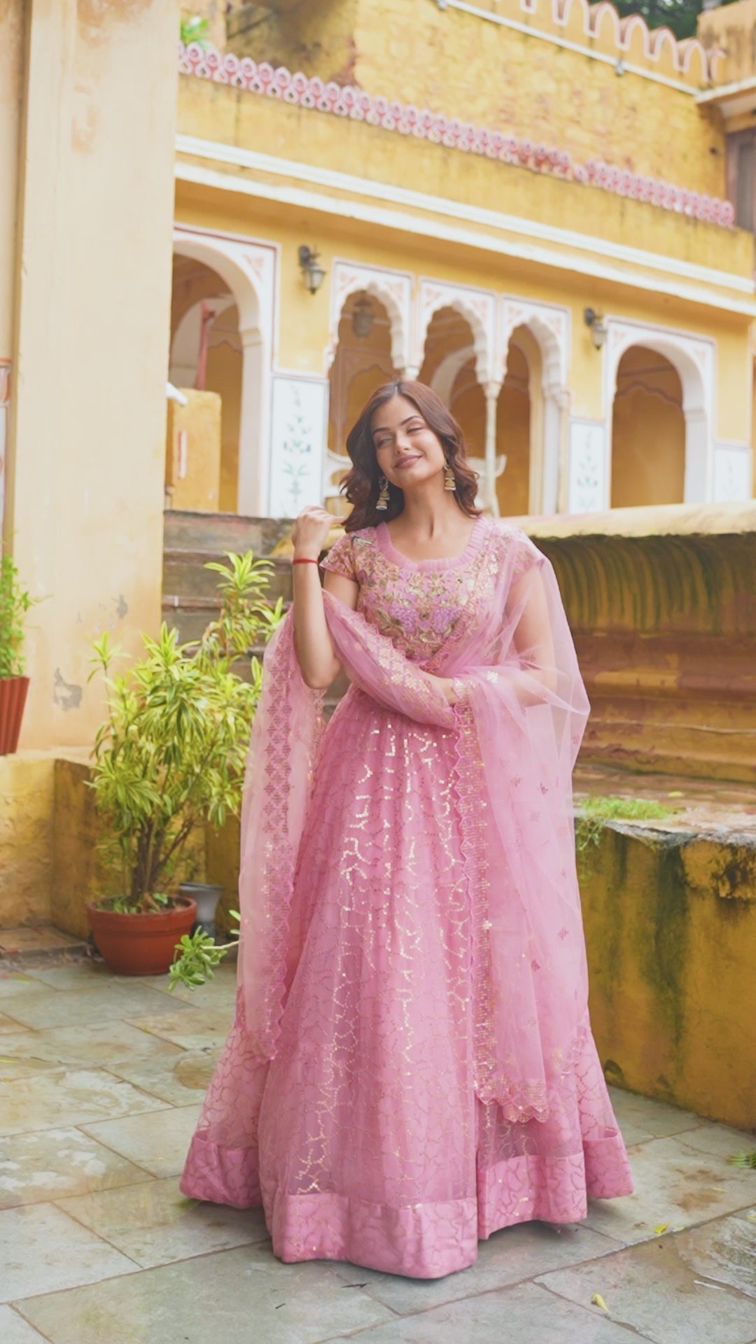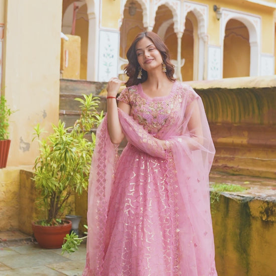 Lehenga: Flowy pink net lehenga adorned with delicate golden sequin embroidery in floral patterns, creating a shimmering effect with every move.