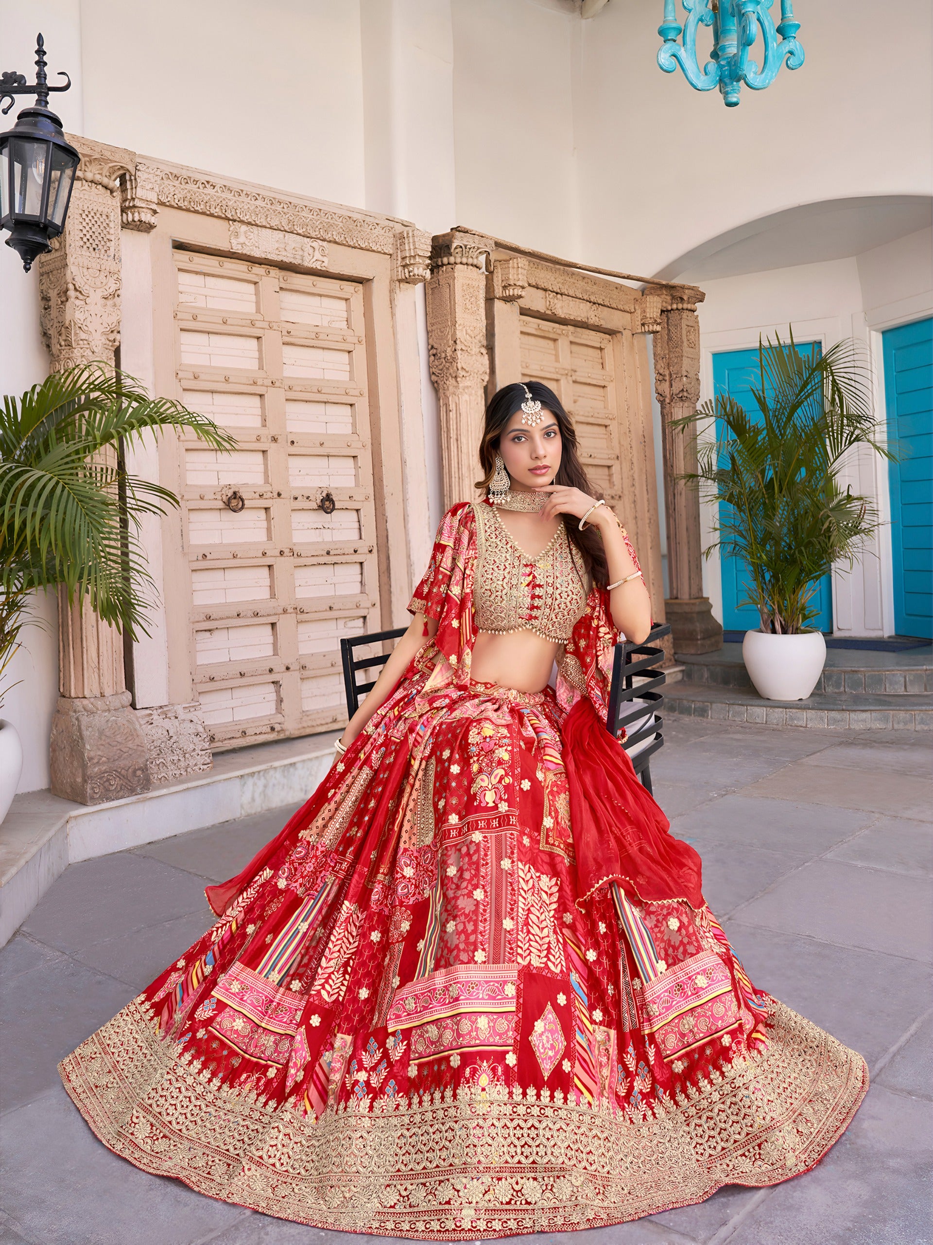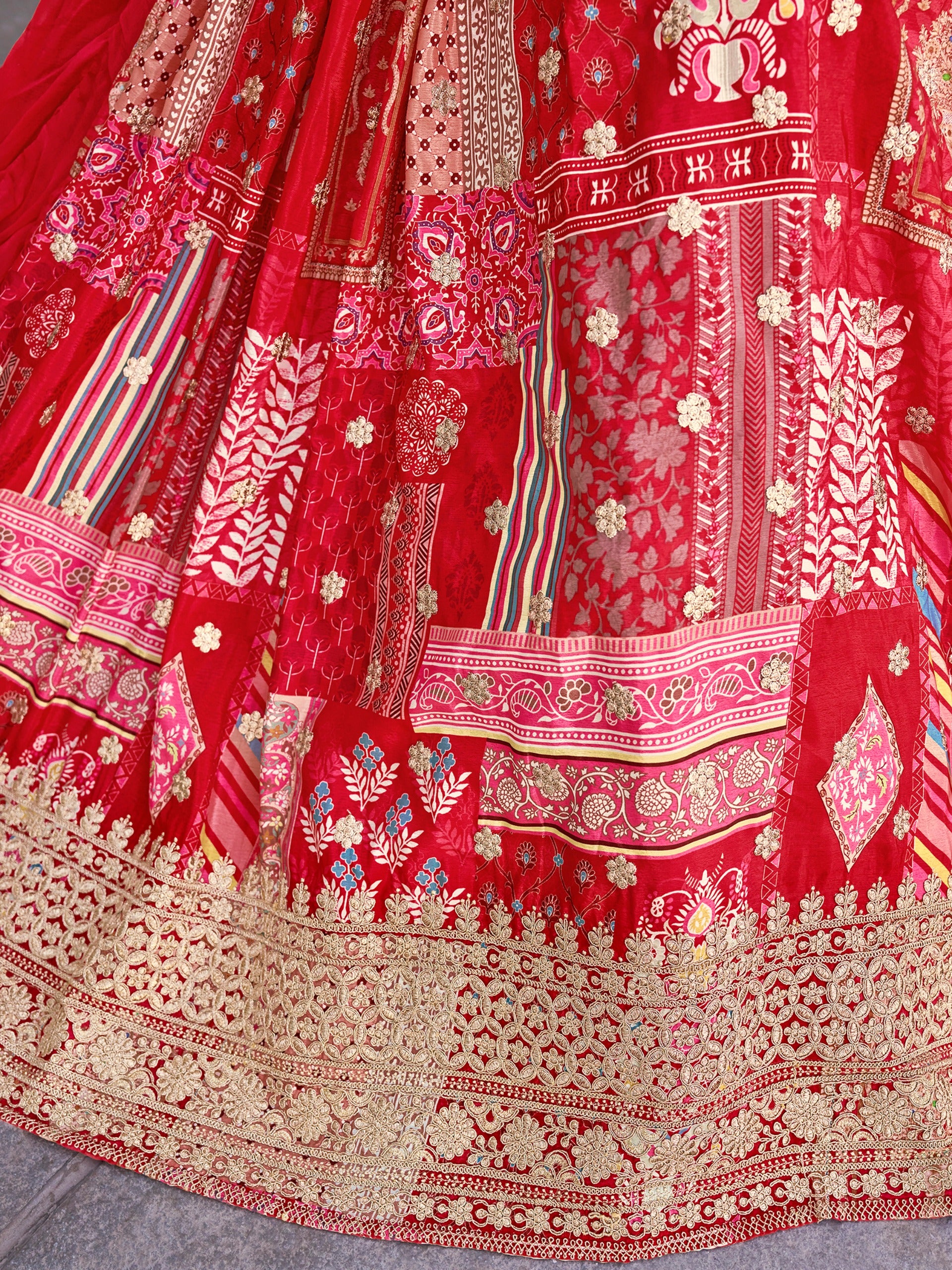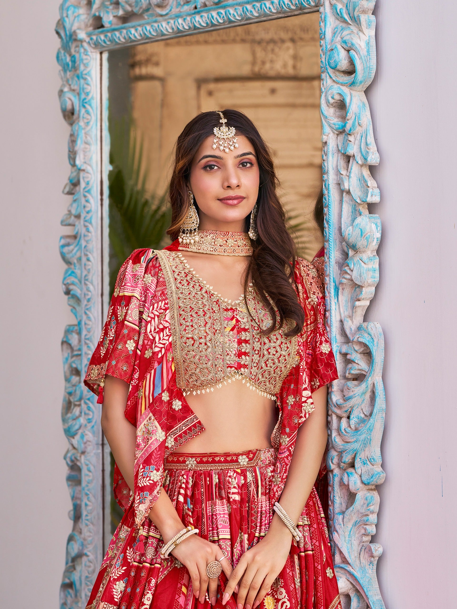Elegant Red Chinnon Silk Lehenga Set with Embroidered Blouse and Chiffon Dupatta