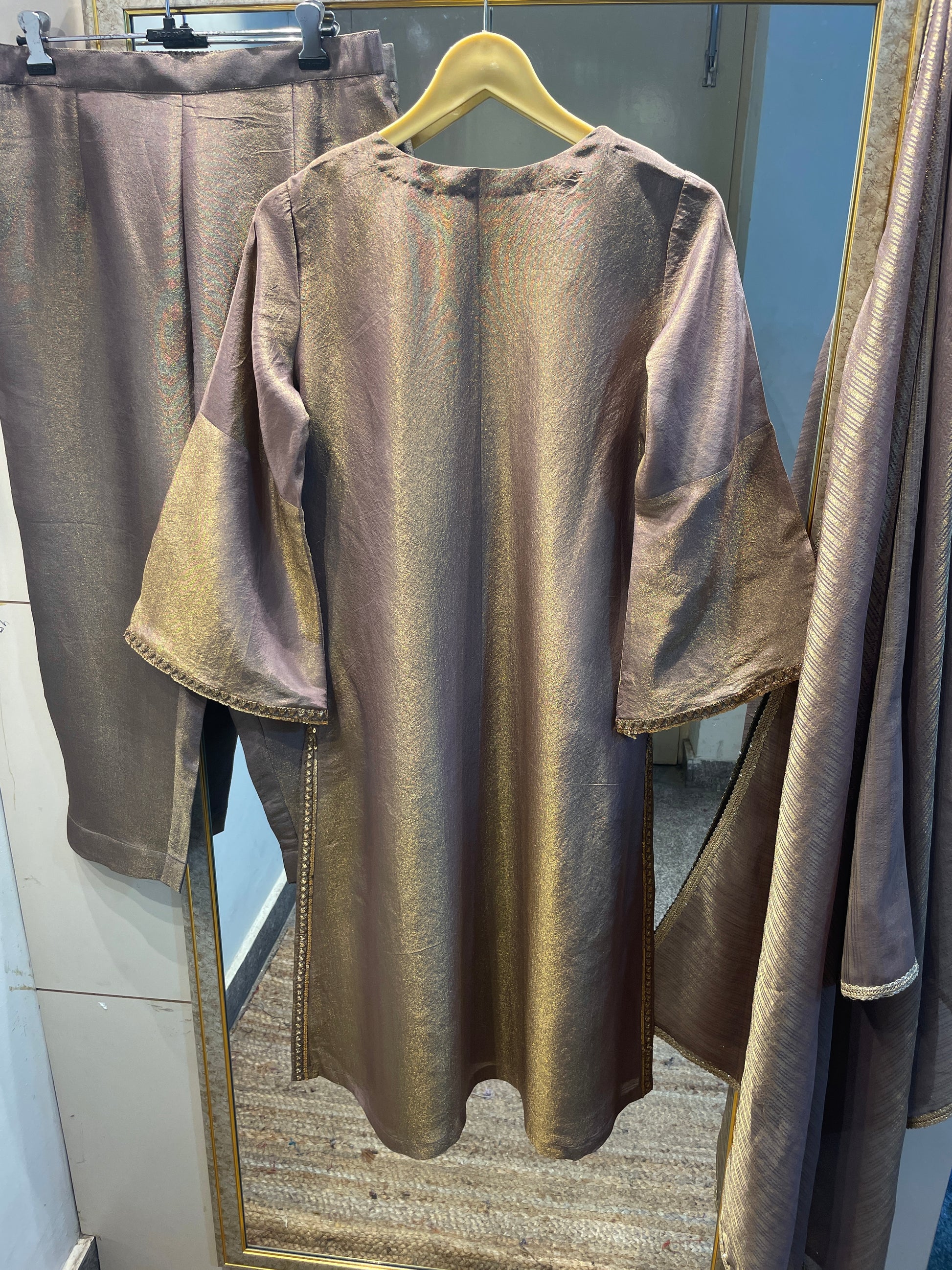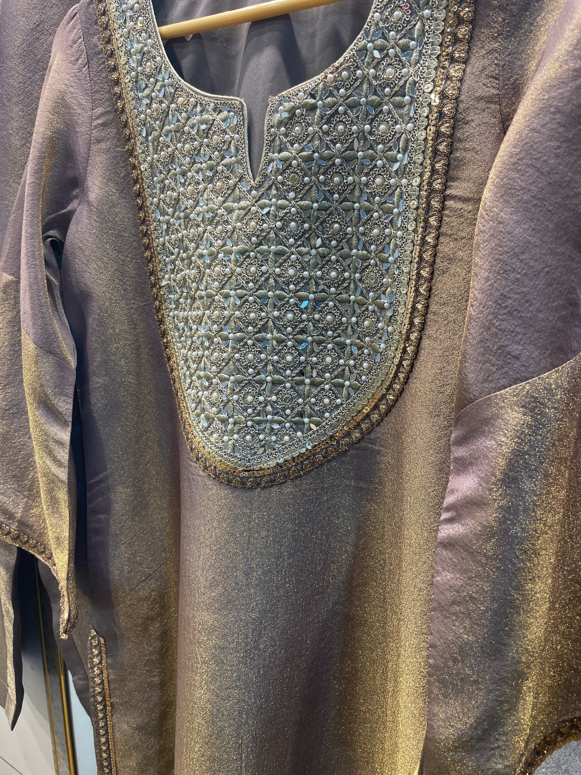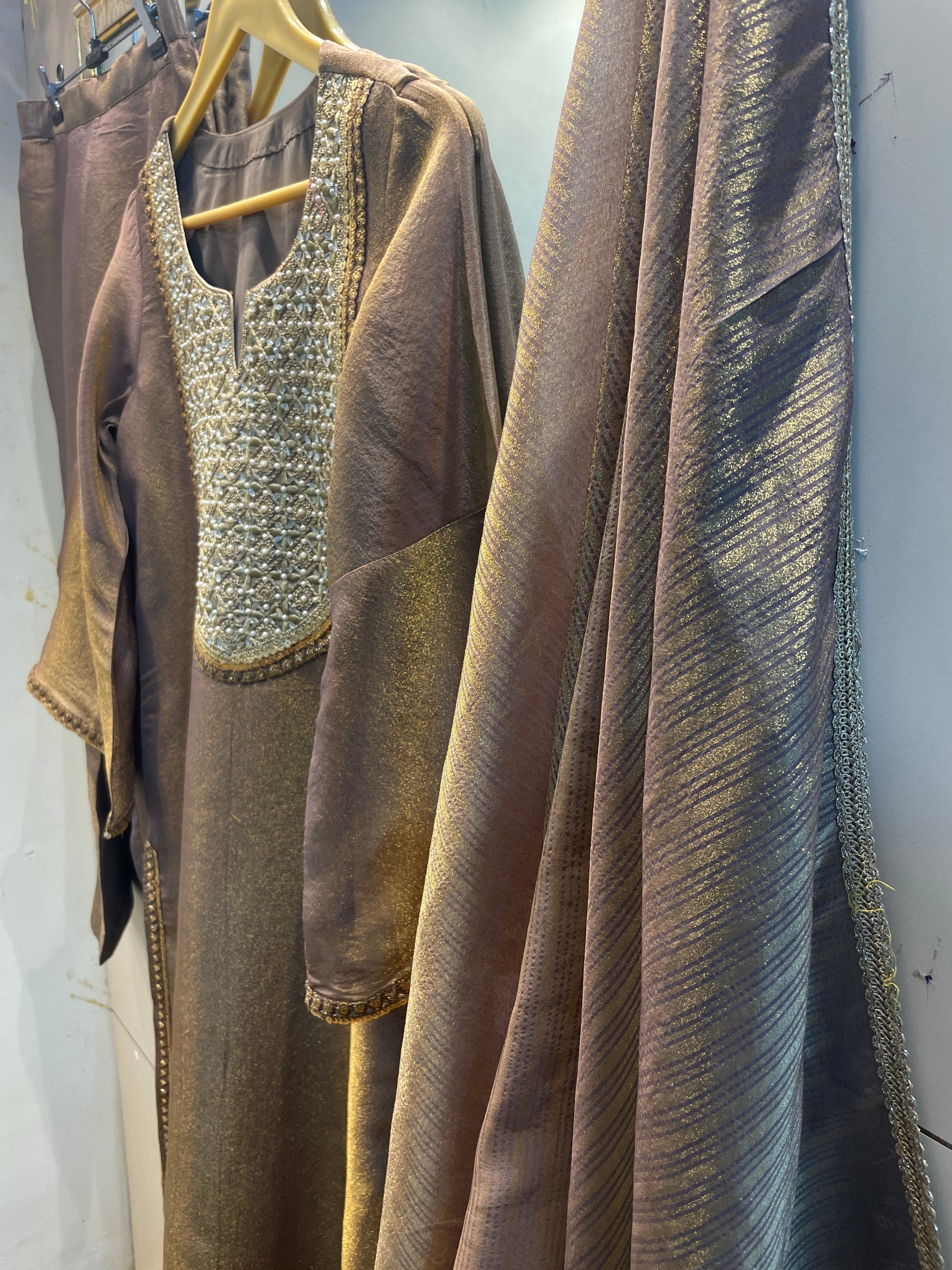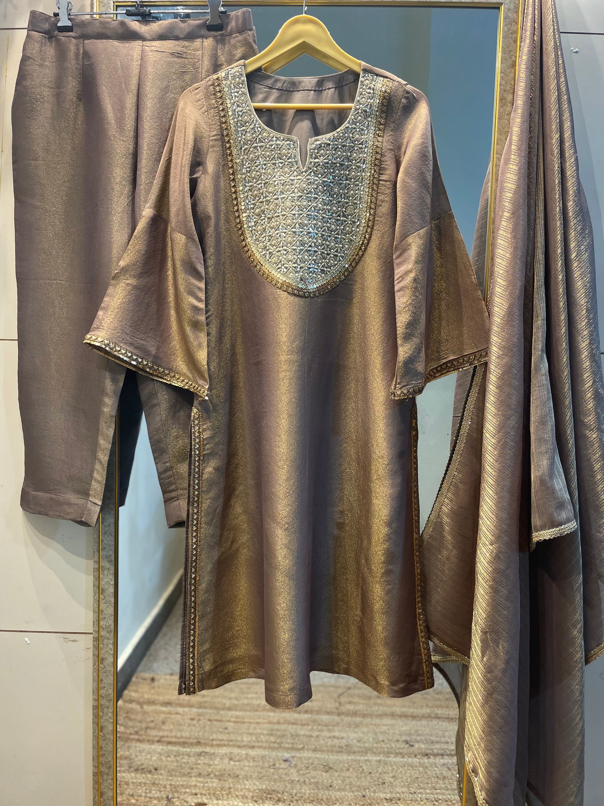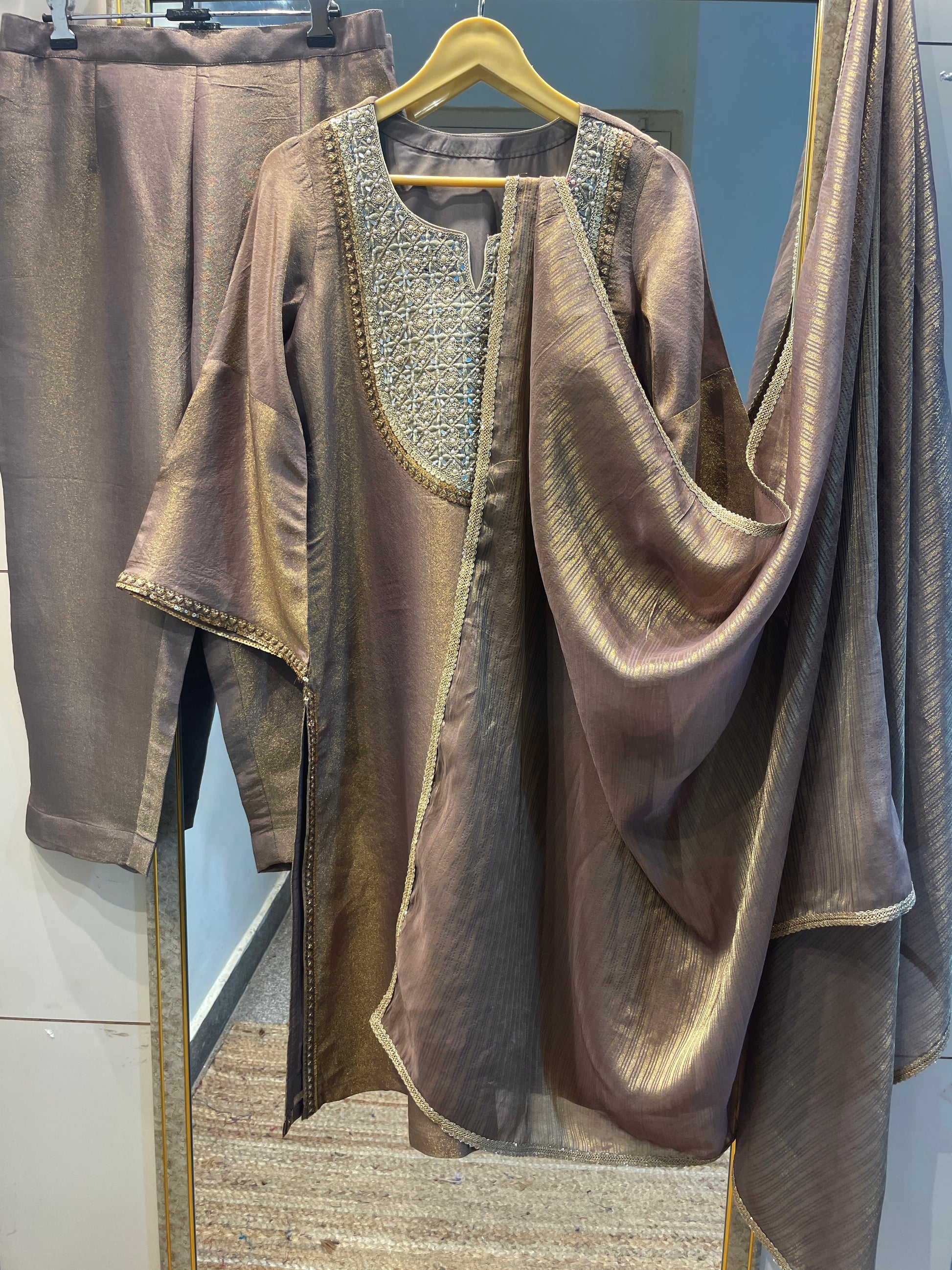 Gold tissue salwar kameez suit traditional Indian designer custom stitched outfit