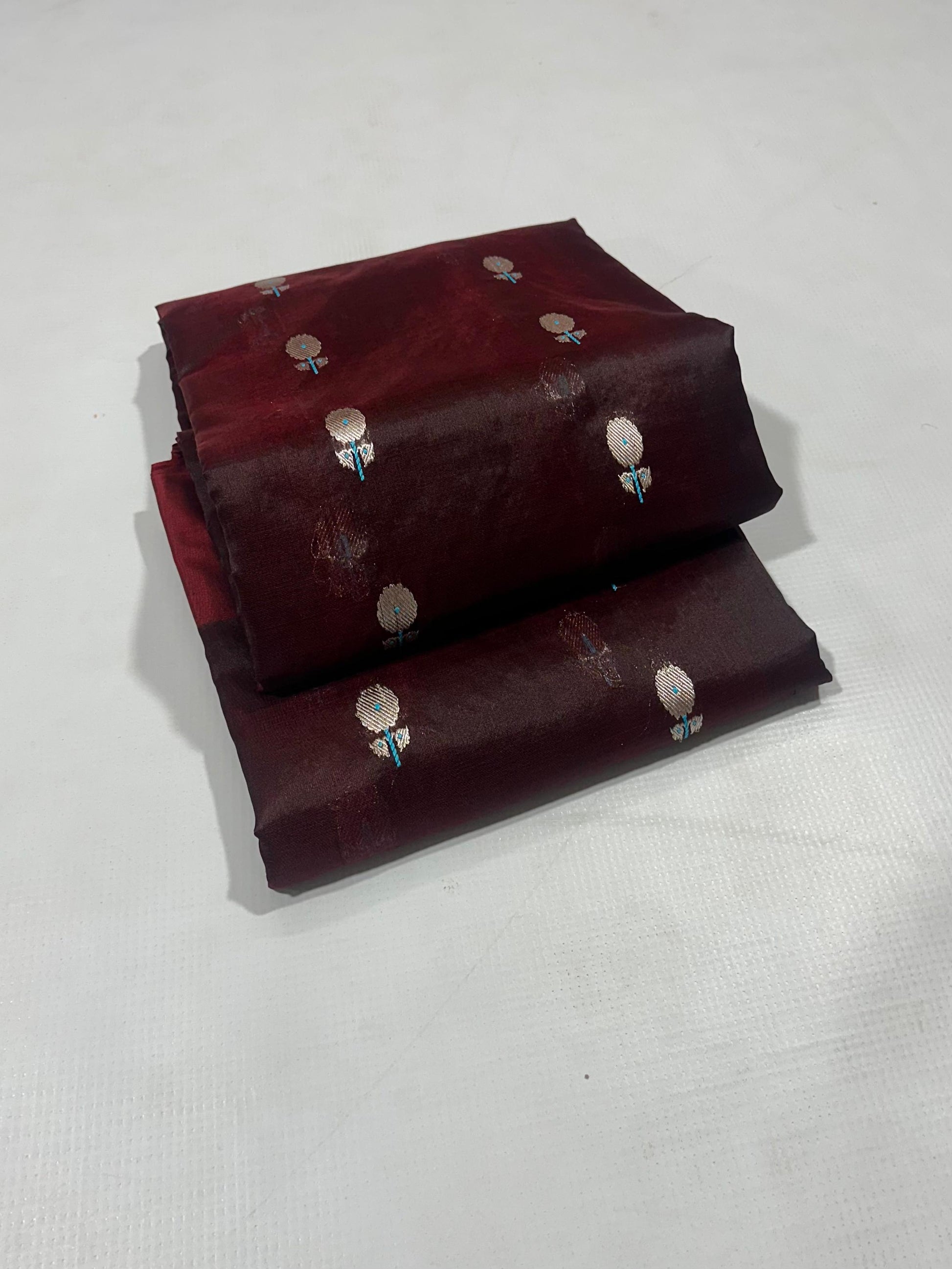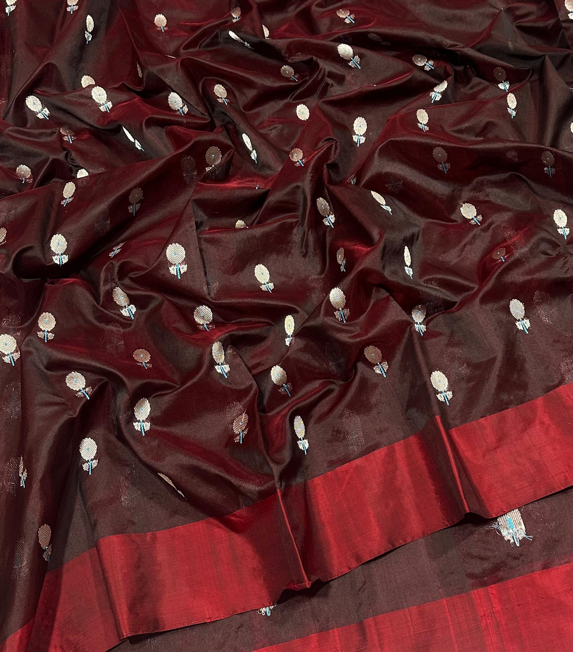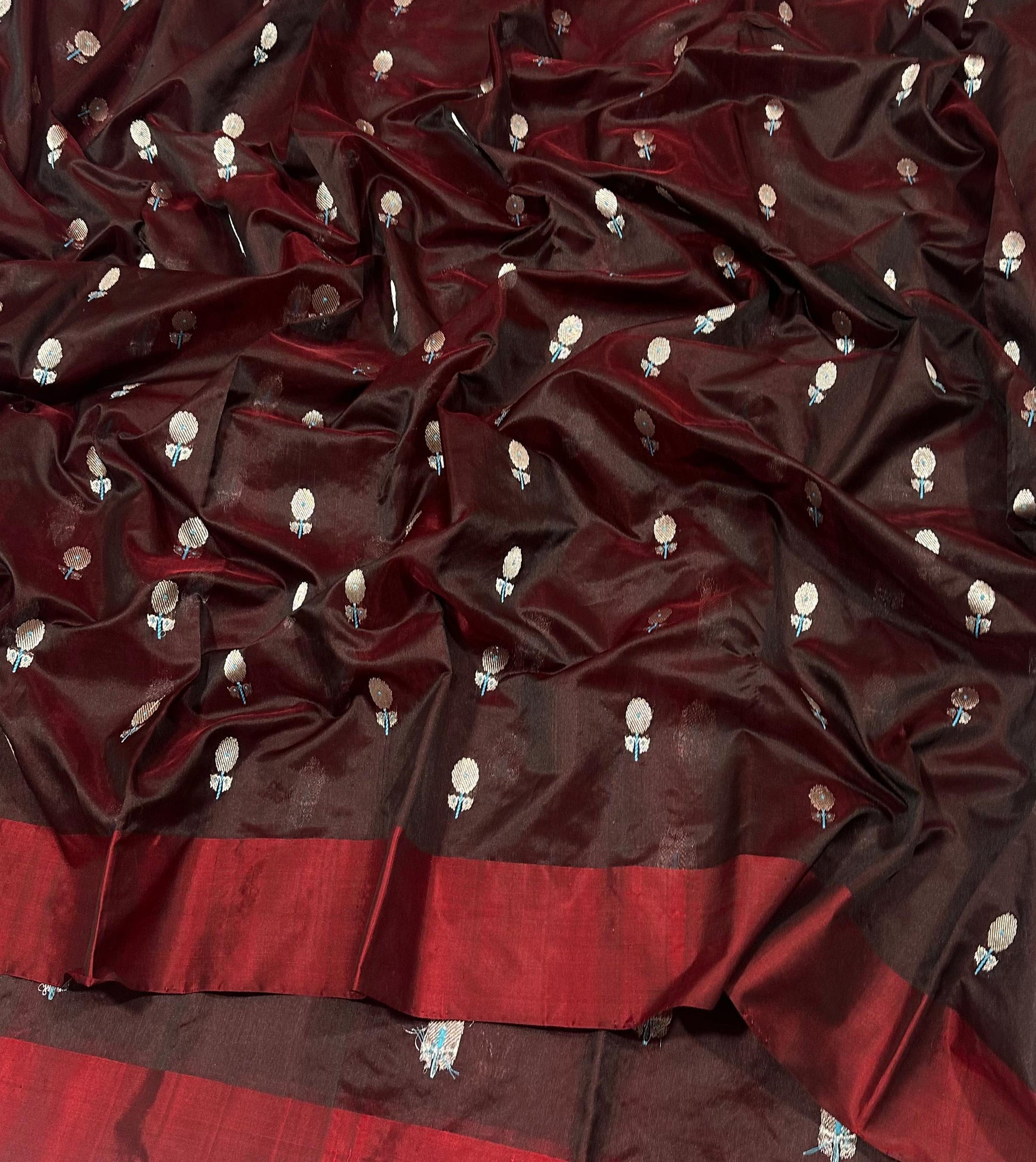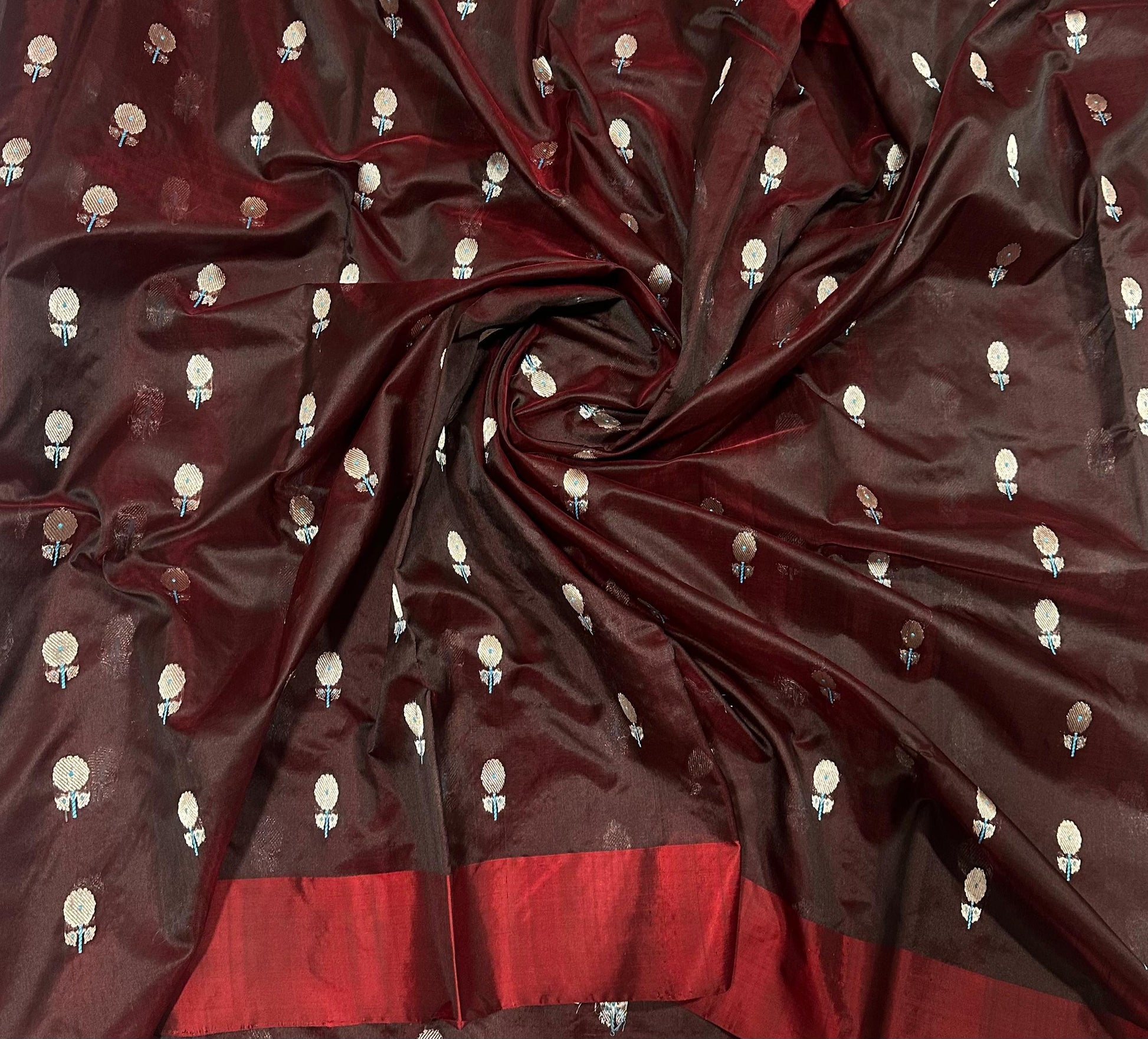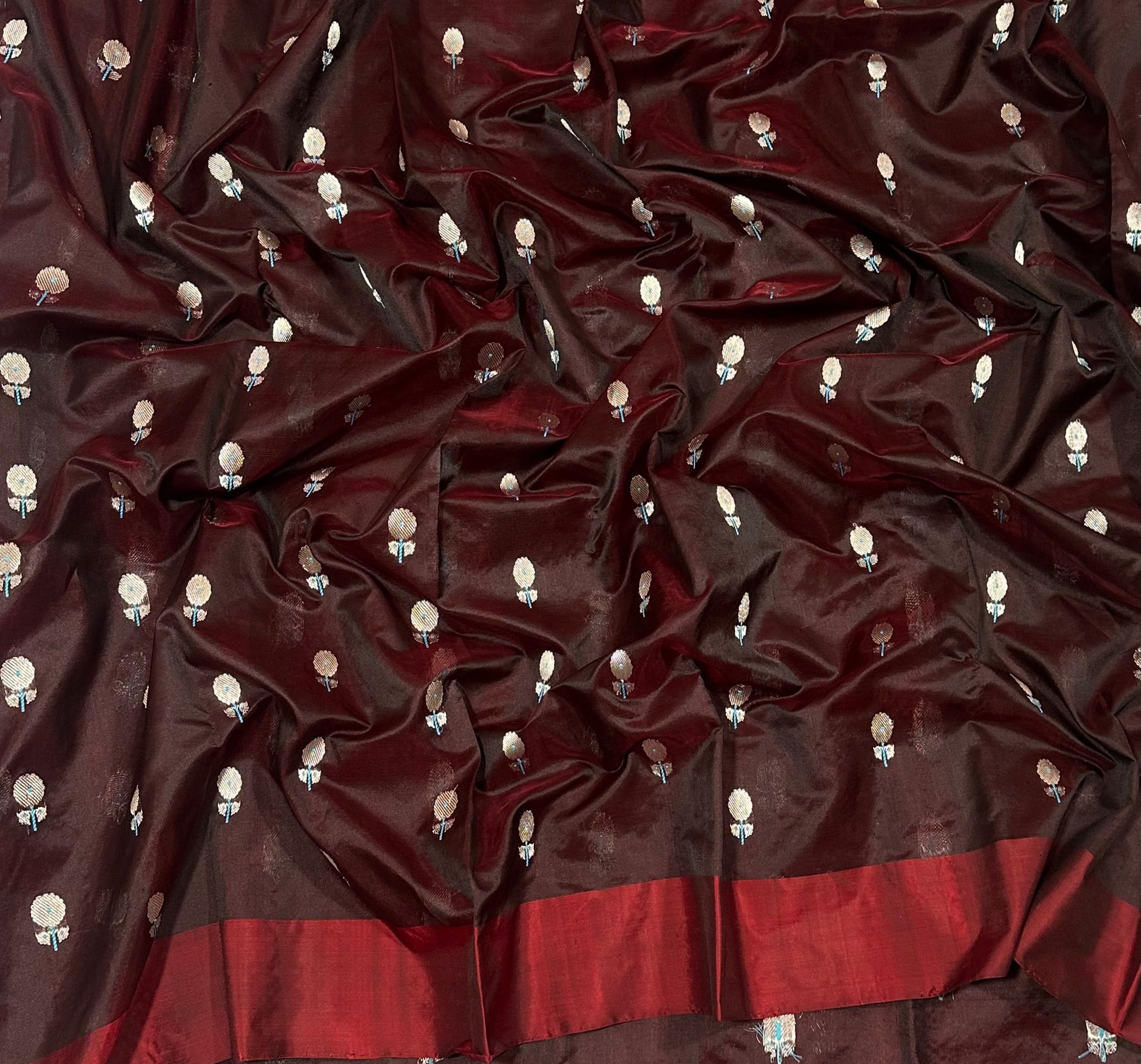 Elevate your ethnic wardrobe with this exquisite Handwoven Maroon & Silver Pattu Silk Saree, a timeless piece that blends tradition with elegance. Crafted from luxurious silk, this saree features a rich maroon body adorned with delicate silver and blue floral motifs, adding a touch of charm and sophistication.