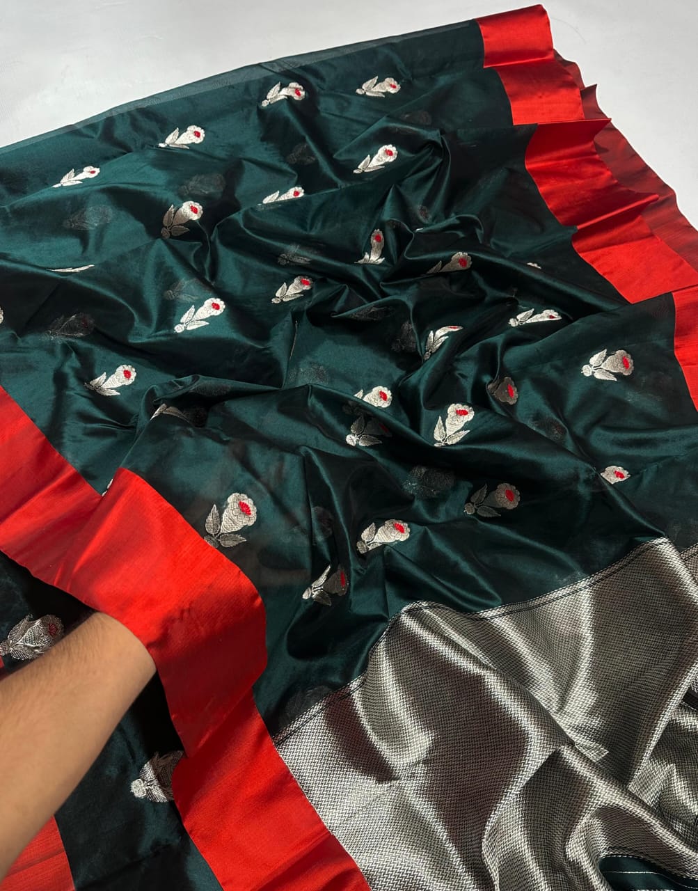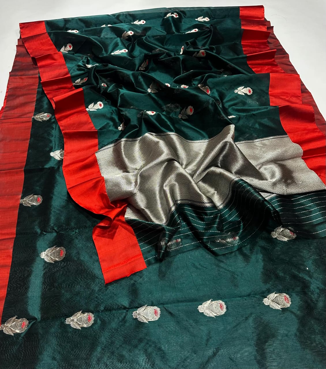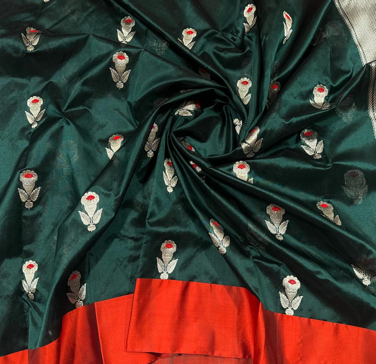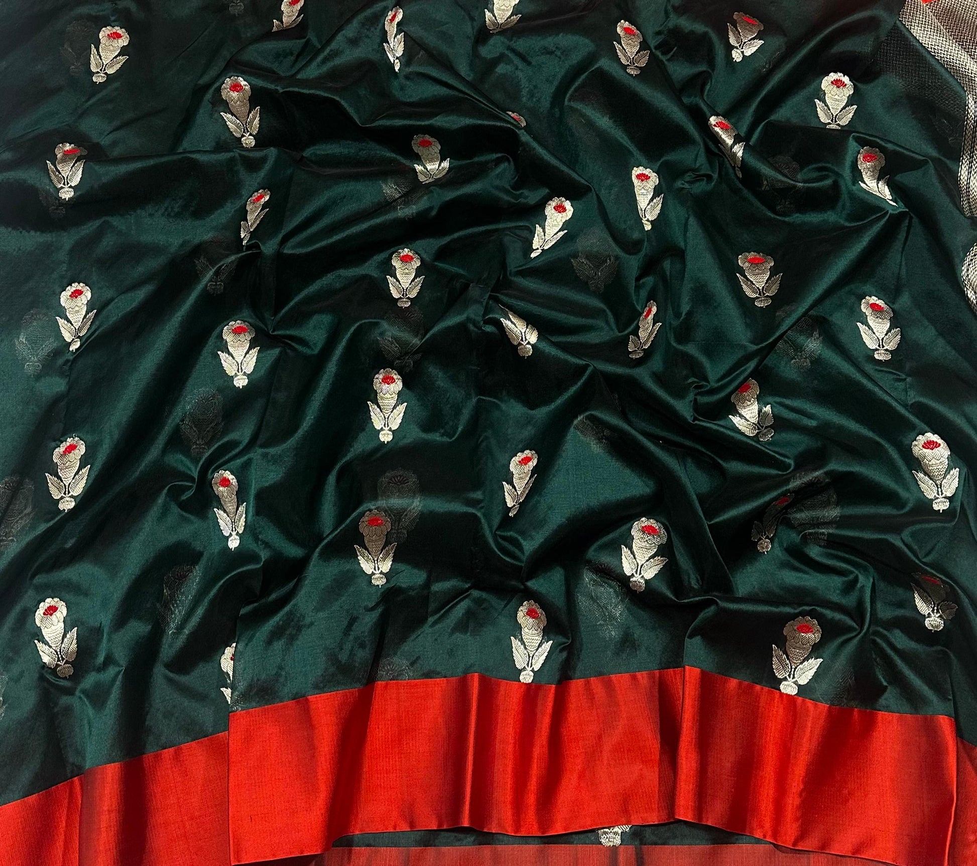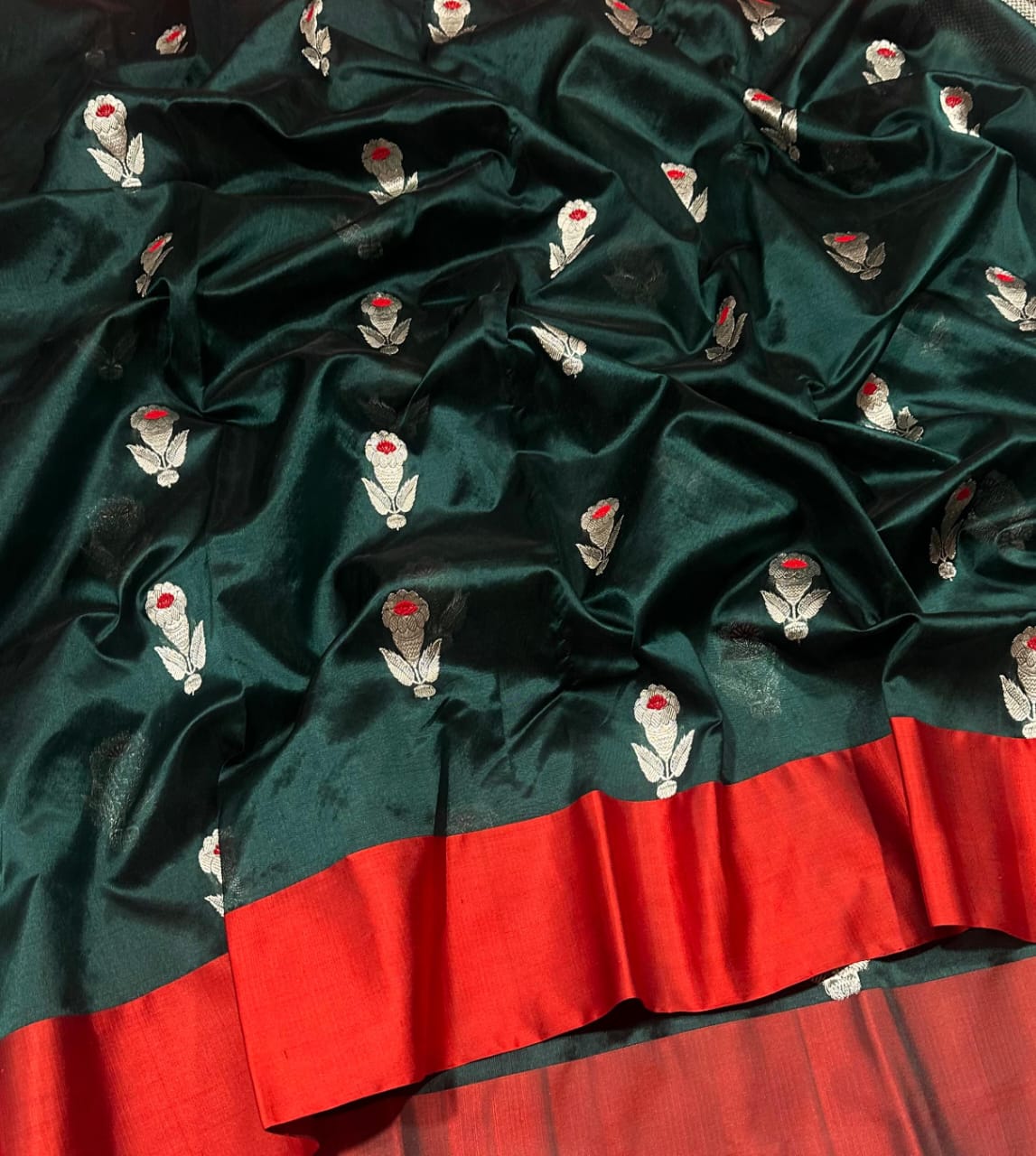 Elevate your ethnic wardrobe with this stunning bottle green pattu silk saree, a perfect blend of tradition and elegance. Crafted from luxurious silk, this saree features intricate golden zari floral motifs with delicate red accents, adding a touch of opulence and charm. The rich contrast red border lends a striking finish, making it ideal for festive occasions, weddings, or traditional gatherings.