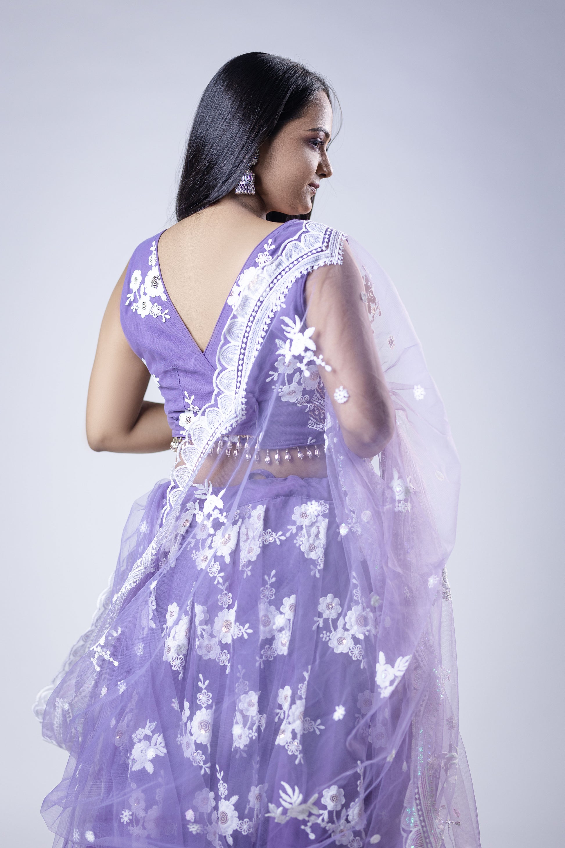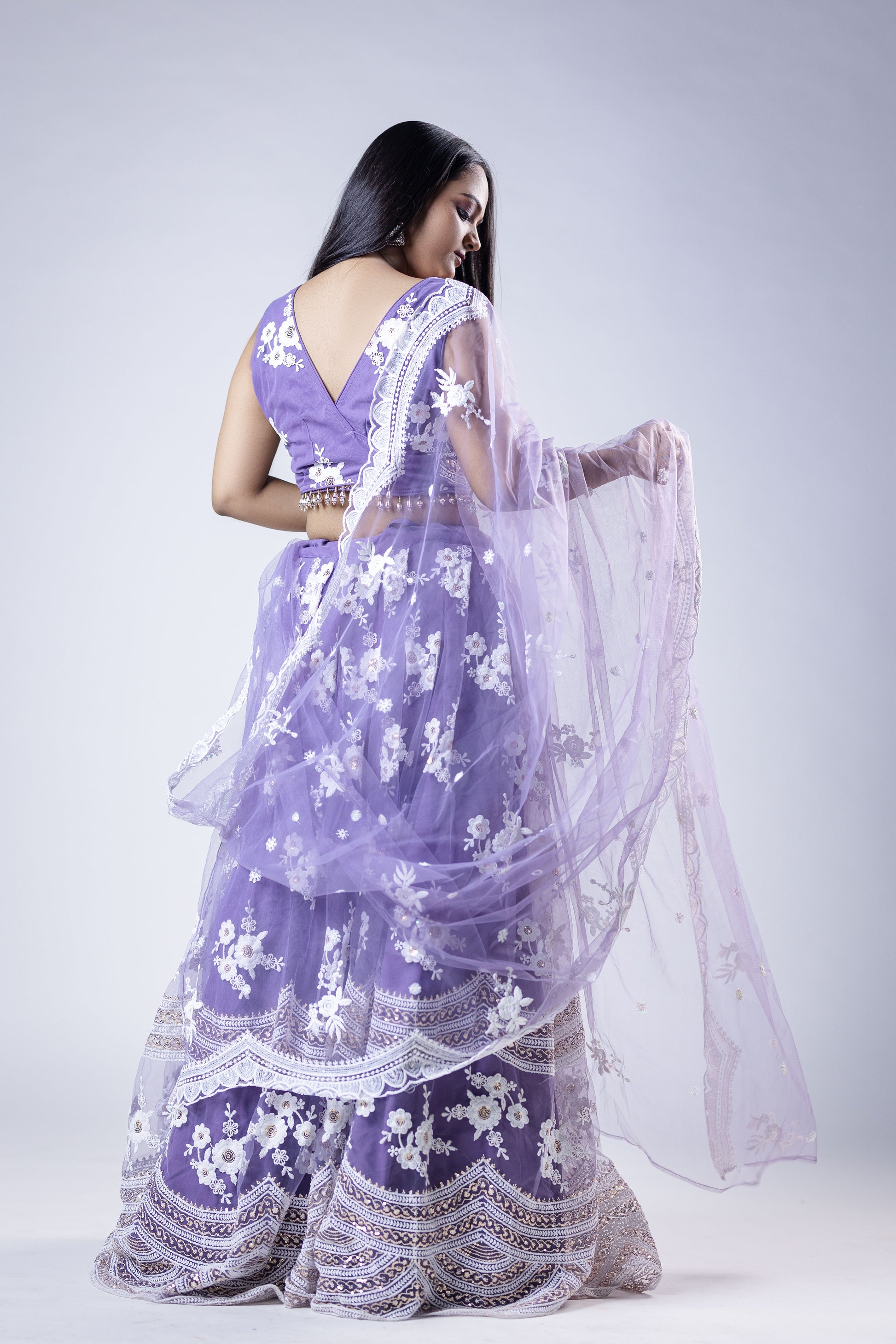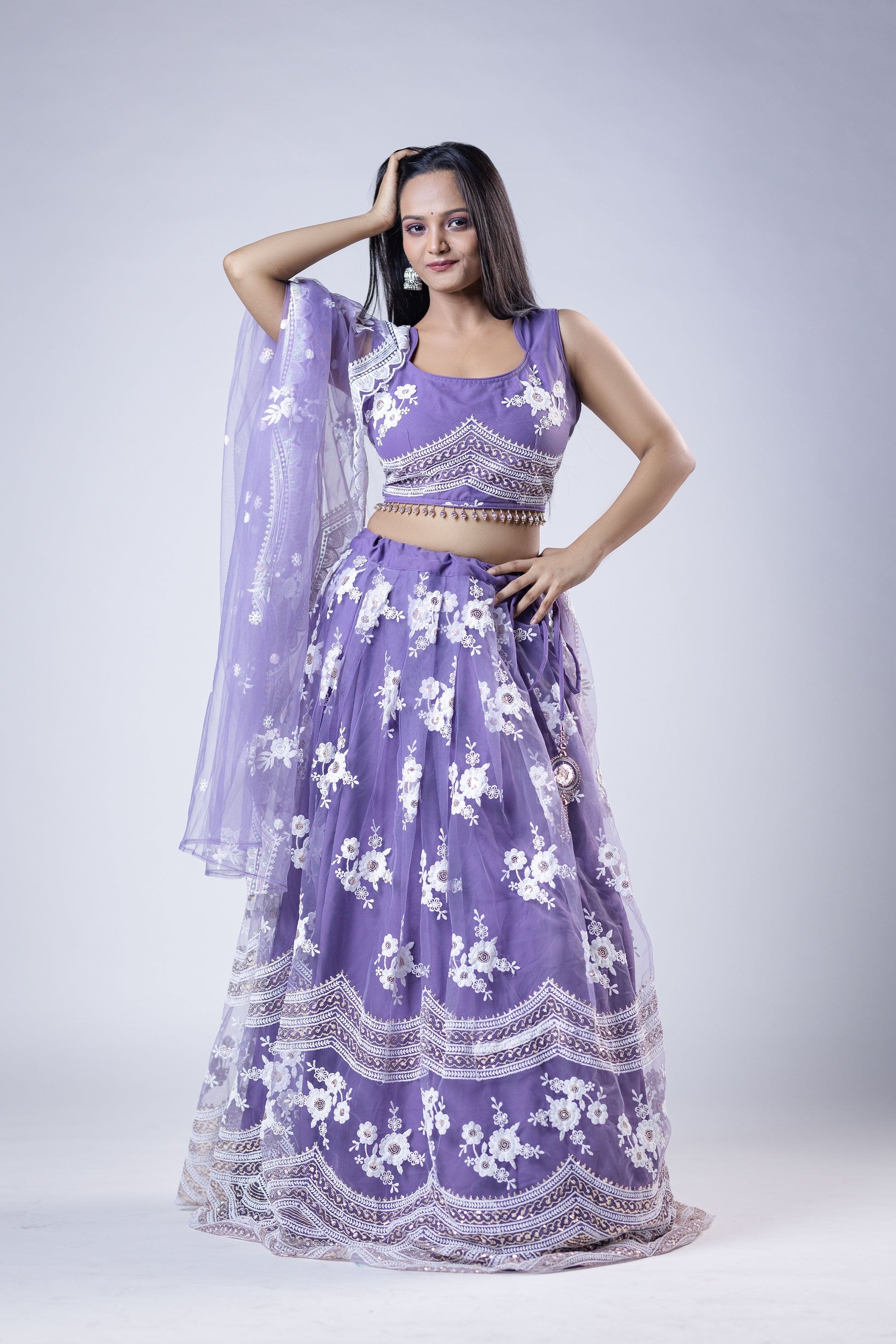 This purple lightweight lehenga is perfect for weddings. Made of embroidered net material, it features delicate white floral embroidery, adding elegant detail to this traditional garment. Its light weight is perfect for dancing and celebrating all night long.
