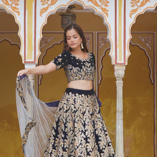 Navy Blue Velvet Embroidered Lehenga Set