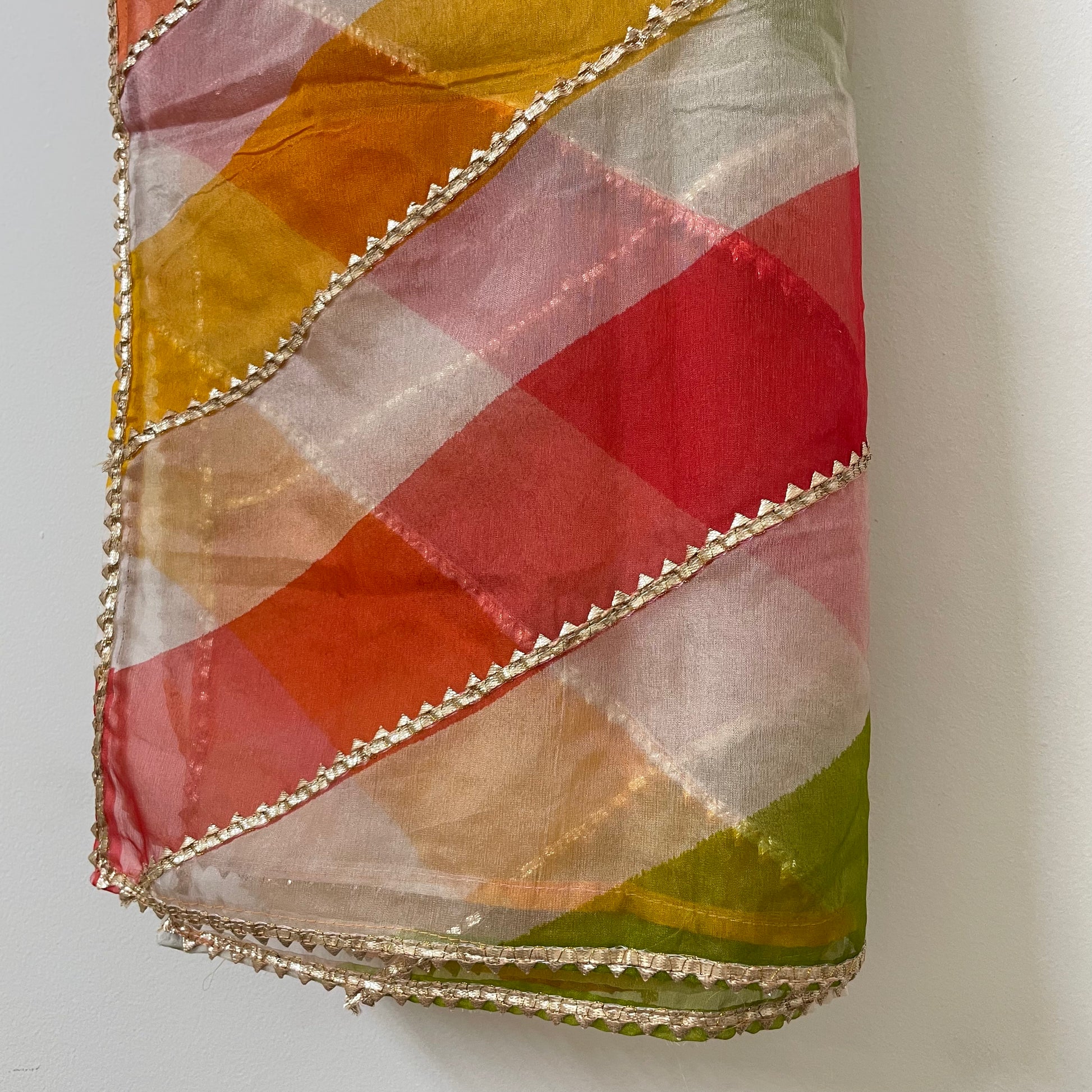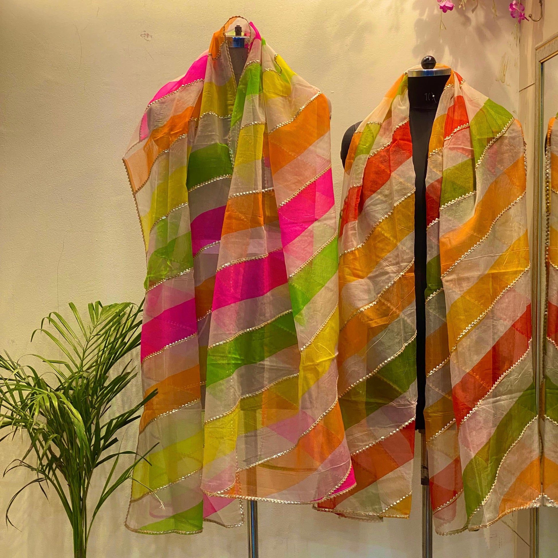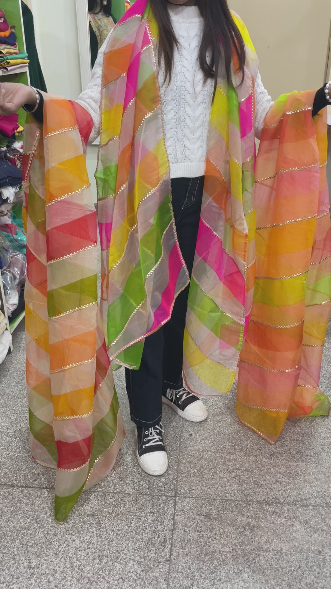 Expertly crafted for weddings and special occasions, this multicolour Organza dupatta for women will add a touch of elegance to any outfit. The lightweight fabric drapes beautifully for a feminine look, while the vibrant colours will complement any ensemble. Elevate your style with this versatile and luxurious dupatta.