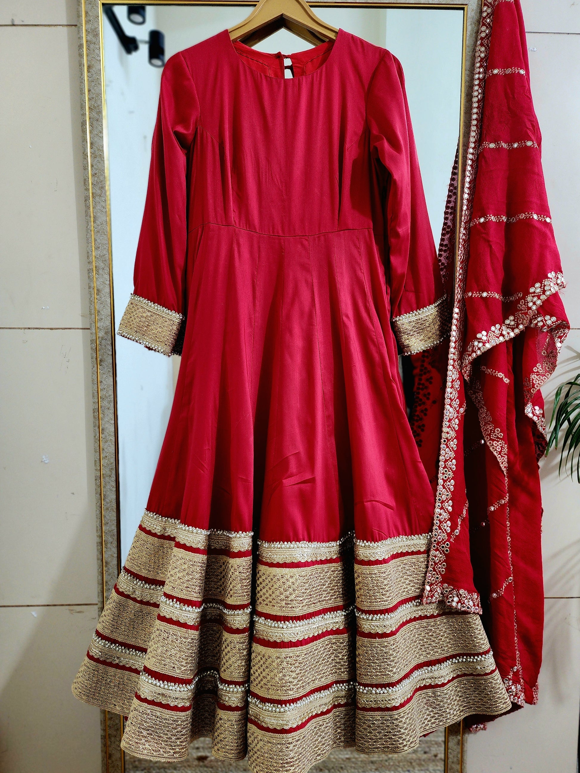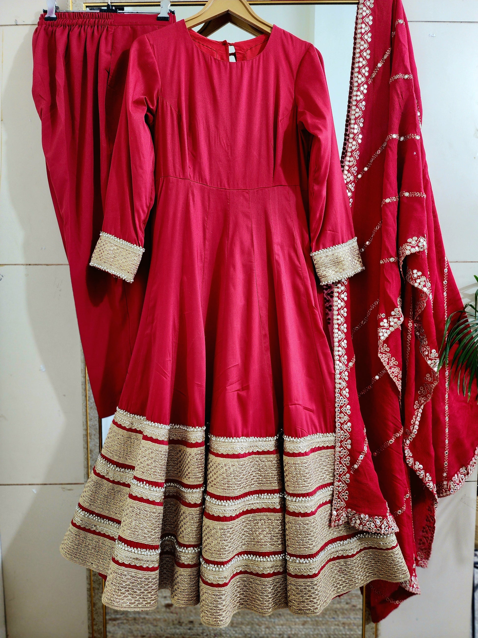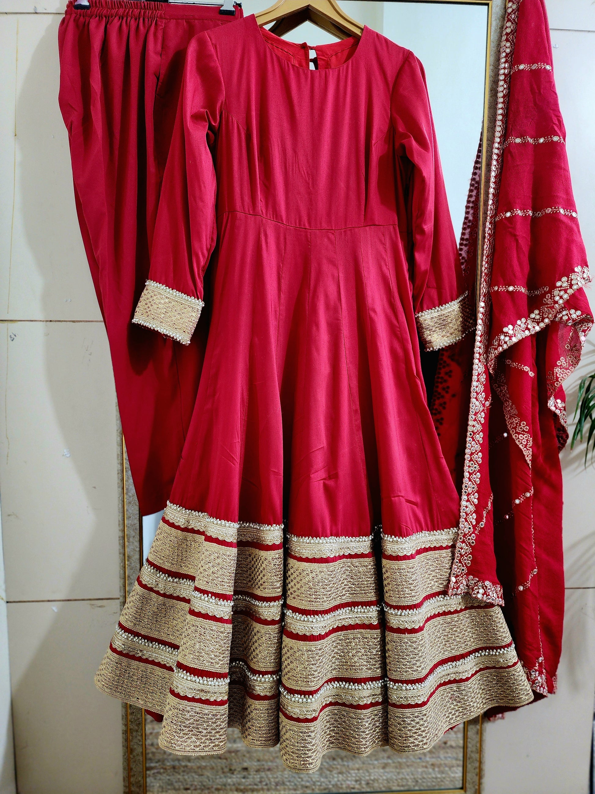 Elevate your style with our Pakistani Style Anarkali Salwar Kameez Suit. Made from luxurious red silk cotton fabric, this suit features traditional Pakistani style and an elegant anarkali silhouette. Perfect for formal events, weddings, or any special occasion. Make a statement while staying true to your cultural roots.