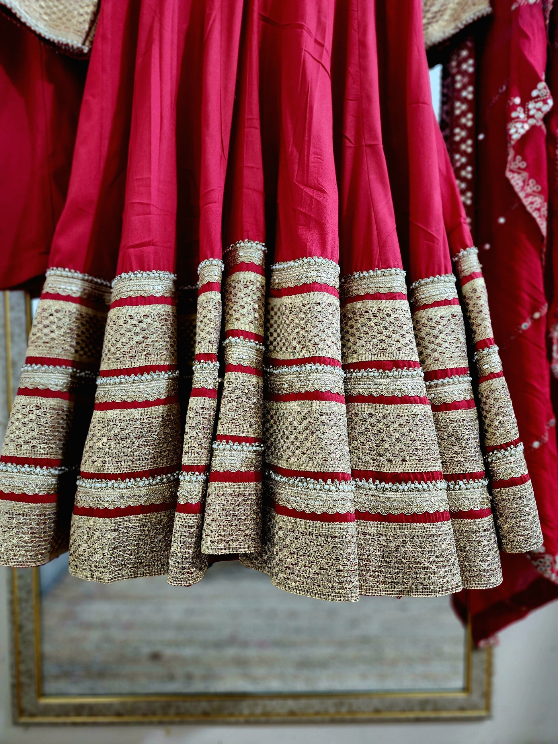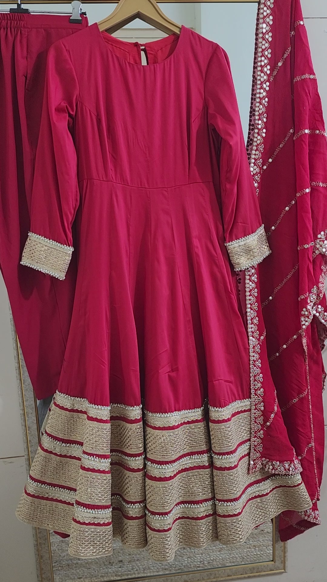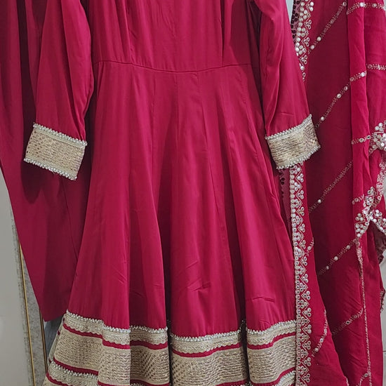Elevate your style with our Pakistani Style Anarkali Salwar Kameez Suit. Made from luxurious red silk cotton fabric, this suit features traditional Pakistani style and an elegant anarkali silhouette. Perfect for formal events, weddings, or any special occasion. Make a statement while staying true to your cultural roots.