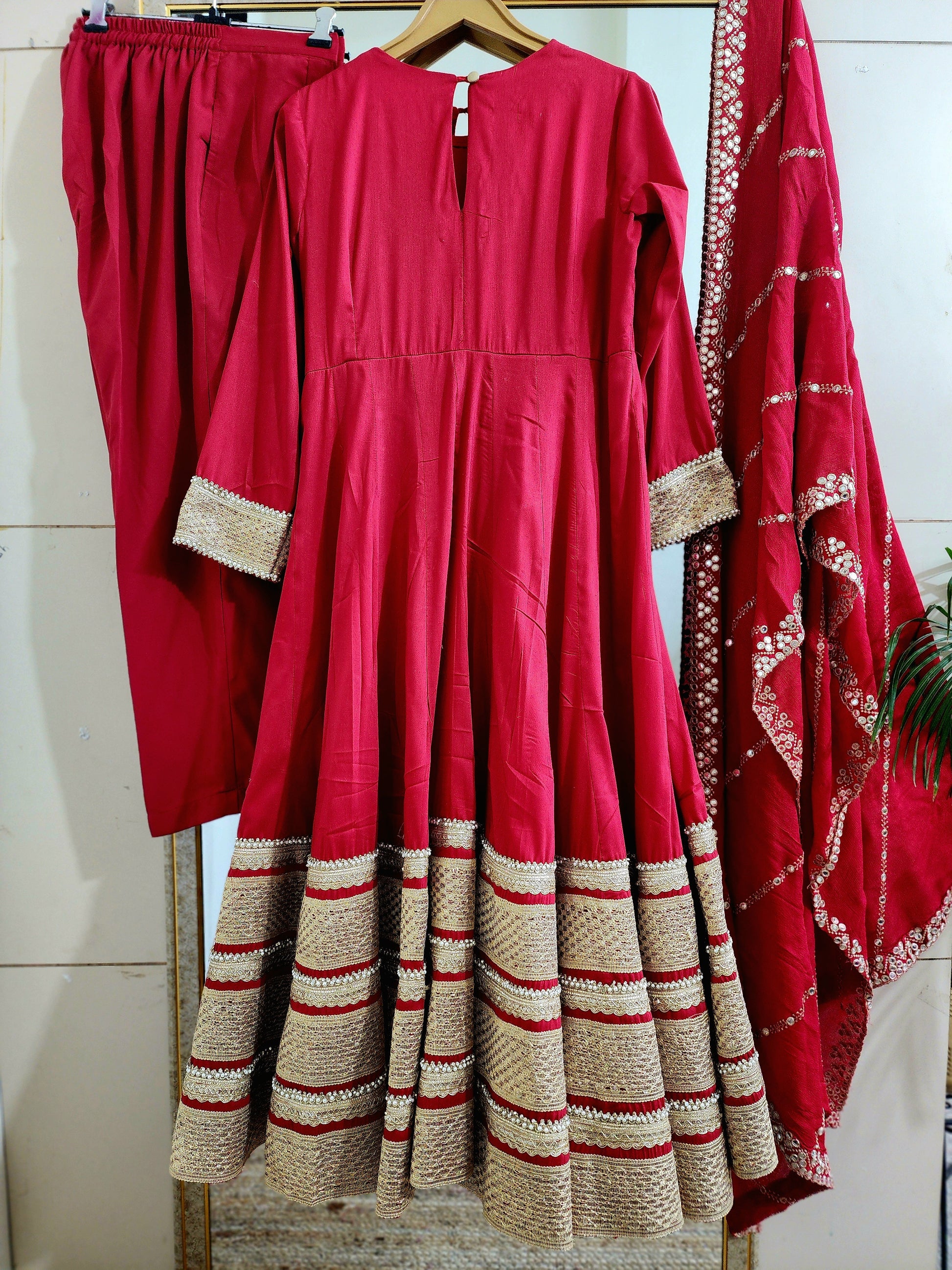 Pakistani Style Anarkali Salwar Kameez Suit Red Silk Cotton Fabric