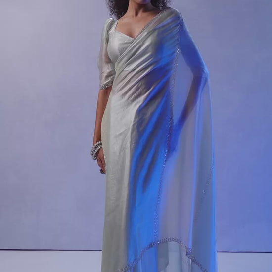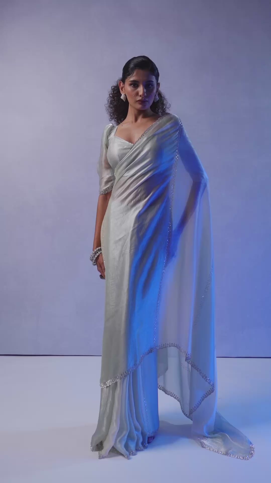 Graceful and effortlessly elegant, this pastel sage green saree is crafted from luxurious organza, lending it a soft sheen and fluid drape. The lightweight fabric floats delicately, enhanced by dainty sequin detailing along the borders for a touch of understated glamour. Perfect for intimate occasions, festive gatherings, or modern bridal events, this saree beautifully blends tradition with contemporary sophistication.