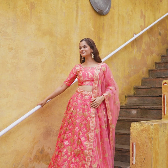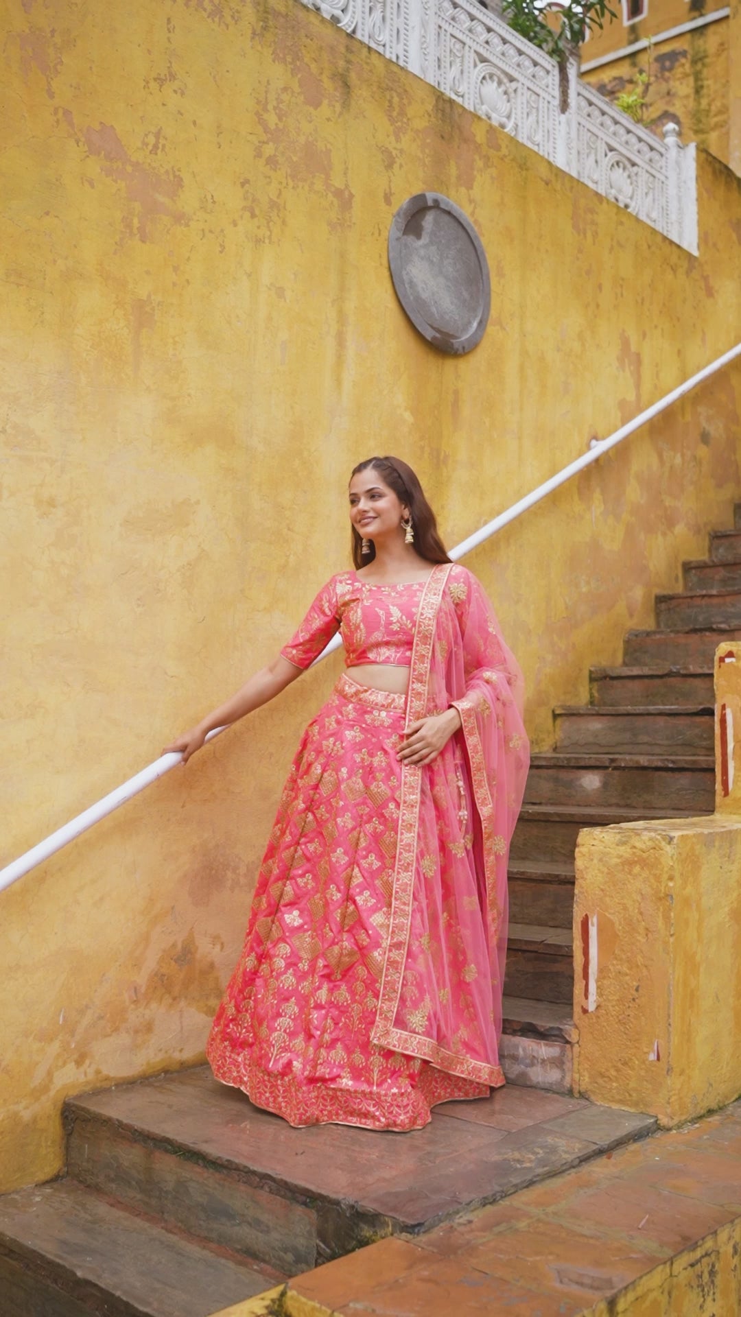 Step into elegance with this stunning peach pink lehenga set, designed to make you the center of attention. Crafted from premium silk fabric, the lehenga features intricate golden zari embroidery in floral and geometric motifs, exuding timeless charm. The matching blouse boasts delicate embroidery and a flattering scoop neckline, paired perfectly with a beautifully bordered net dupatta.