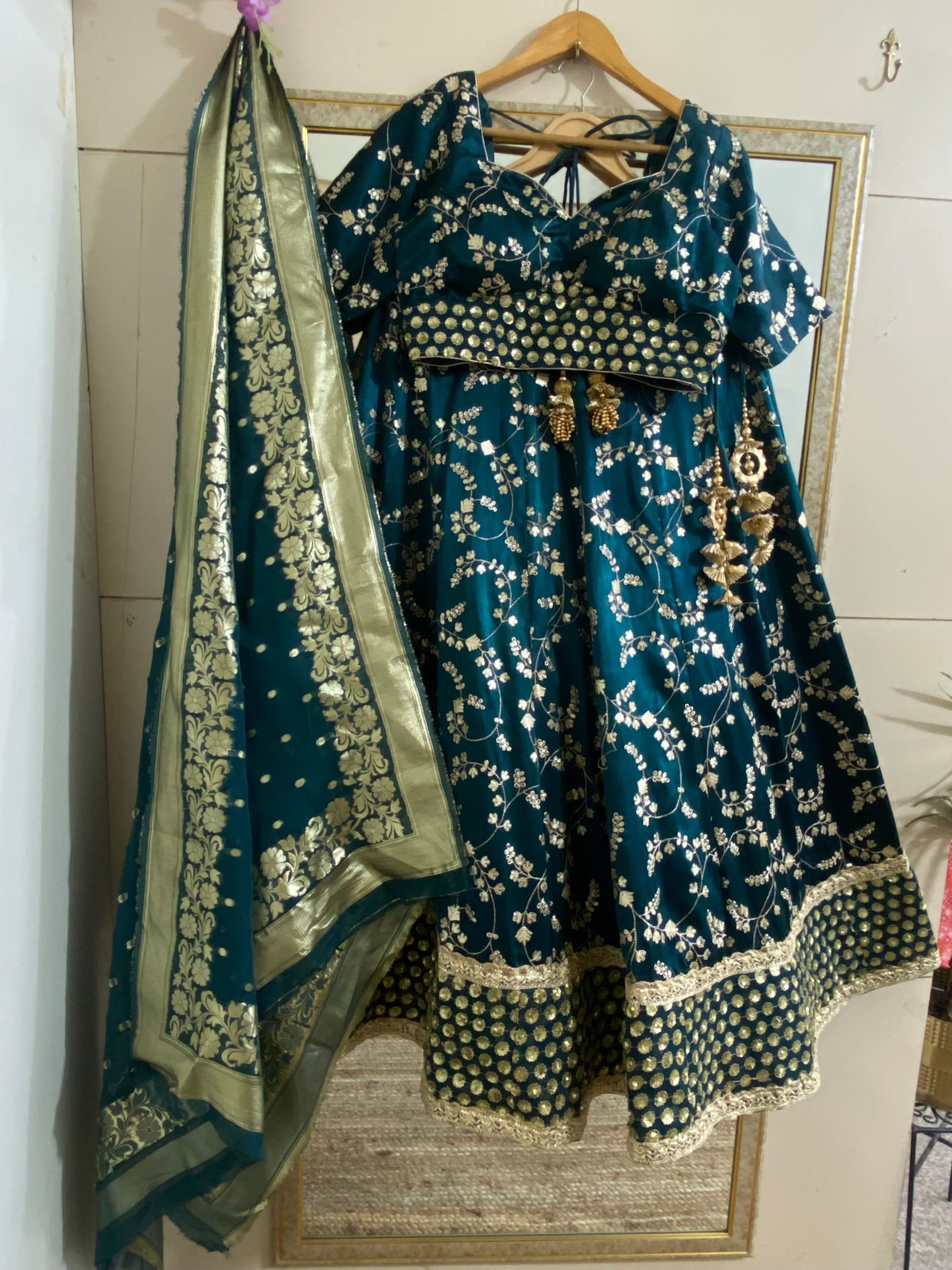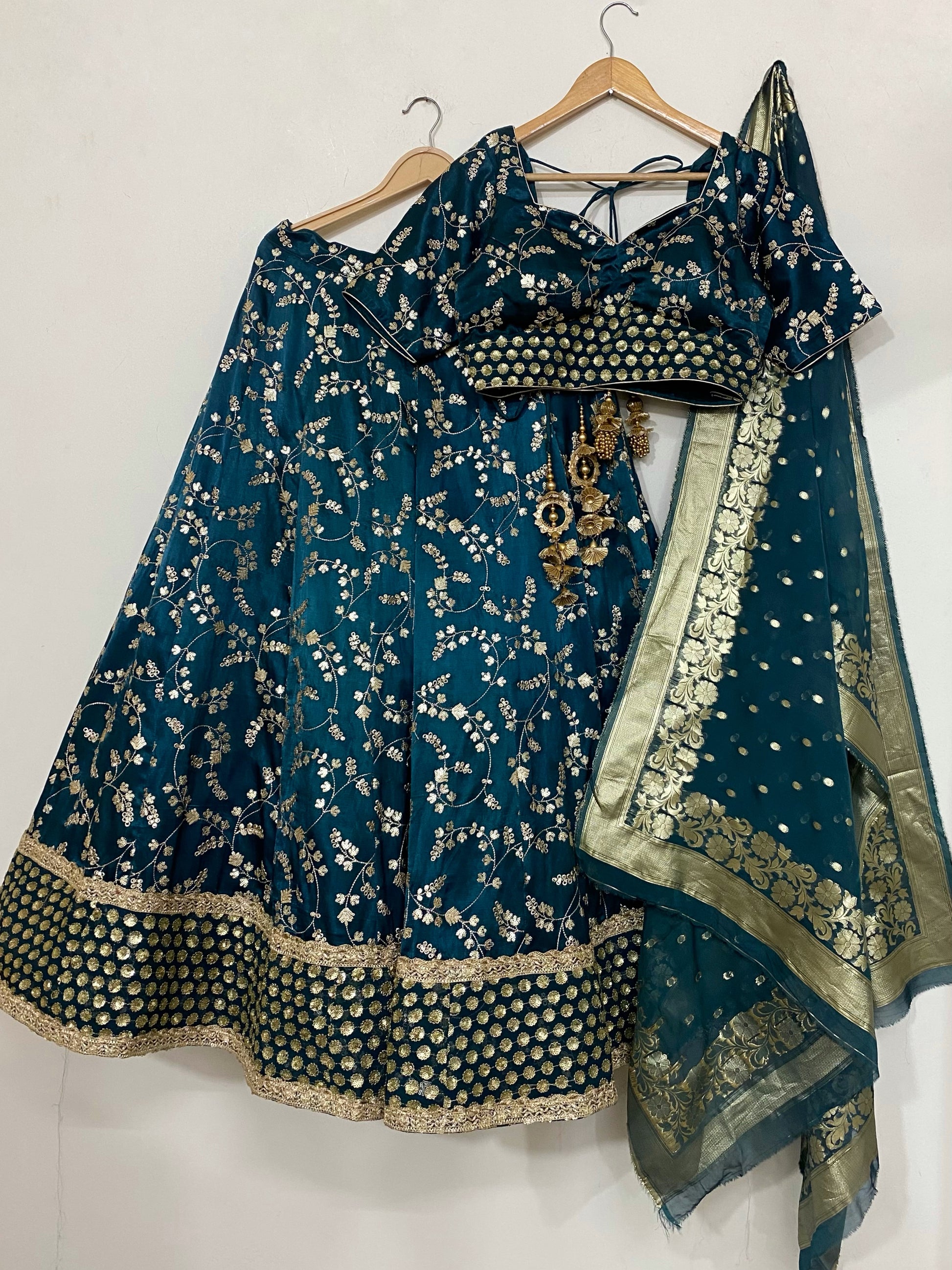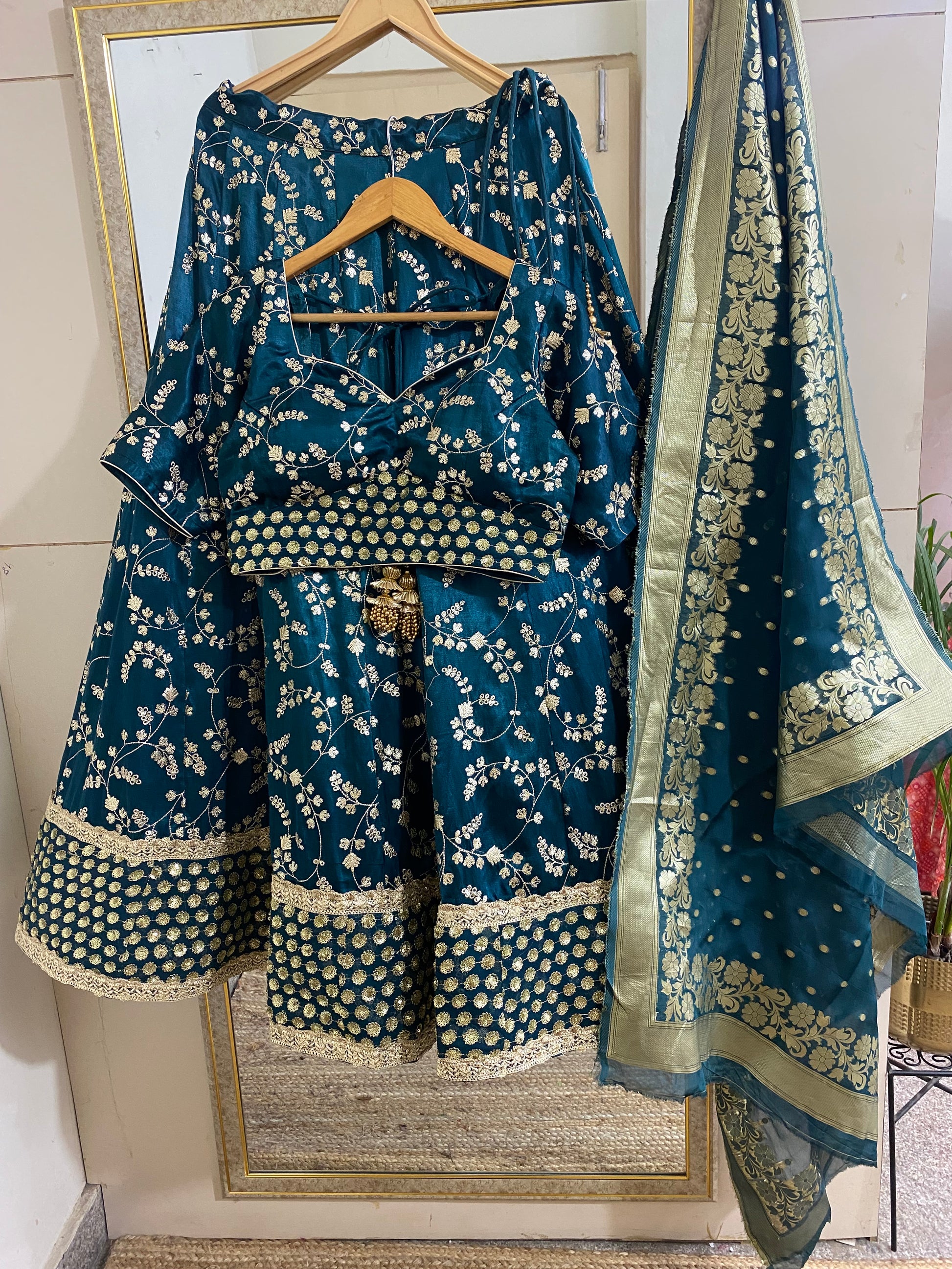 This Peacock green lehenga choli set is perfect for any occasion. Made with high quality materials and expert craftsmanship, it's ready to wear and will make you stand out in the crowd. With its vibrant color and intricate design, this set is a must-have for your wardrobe.