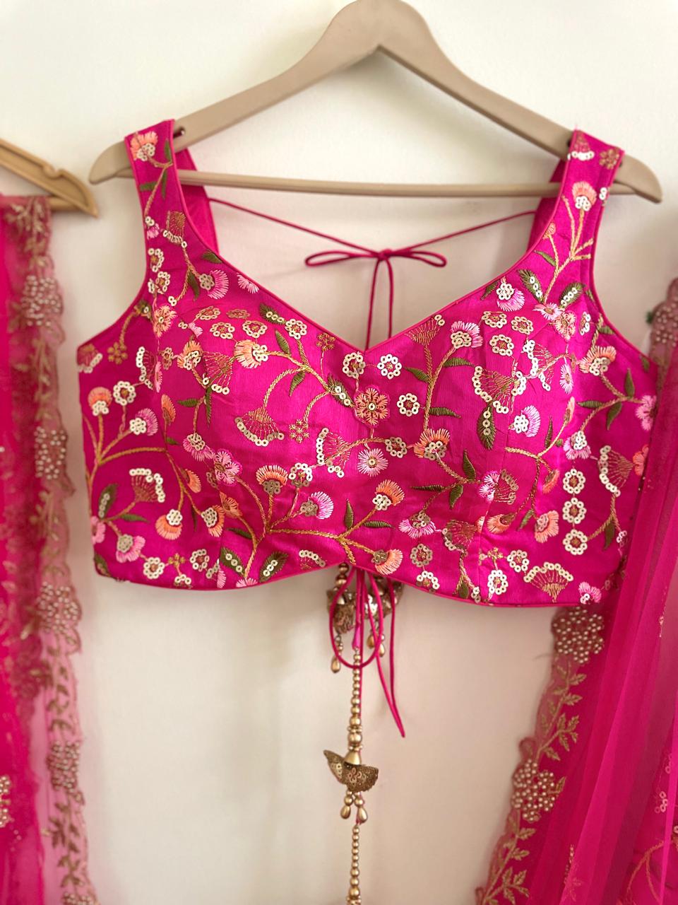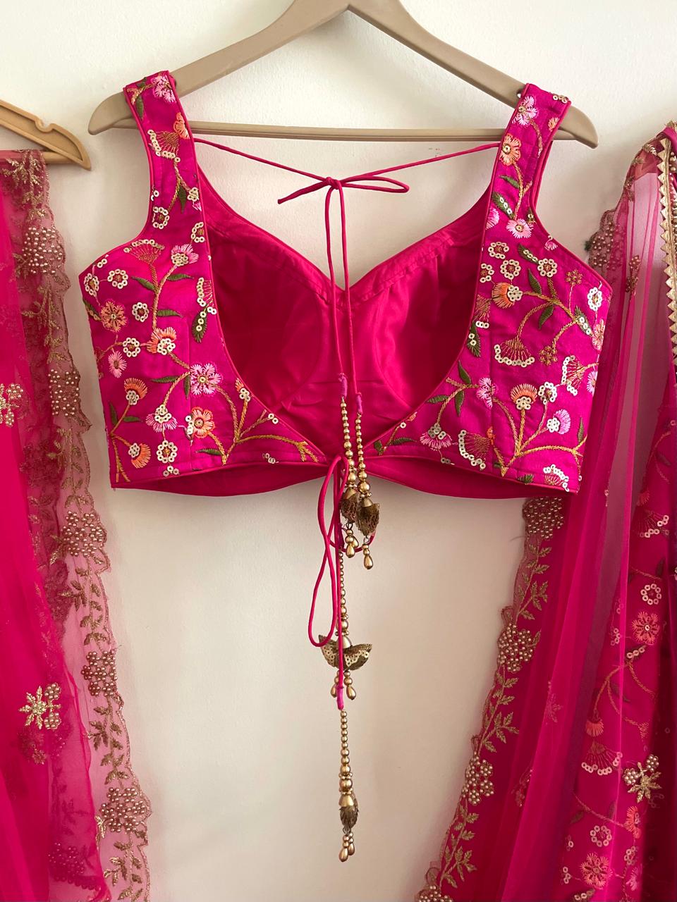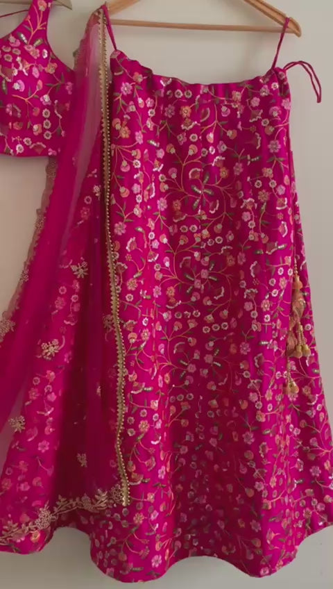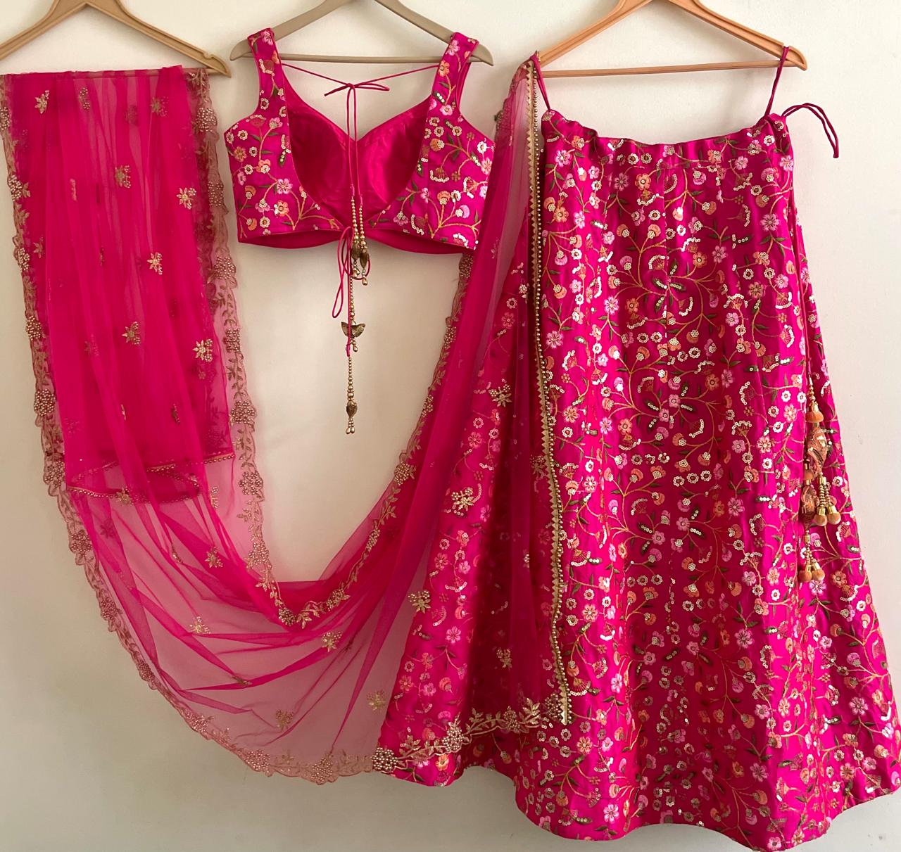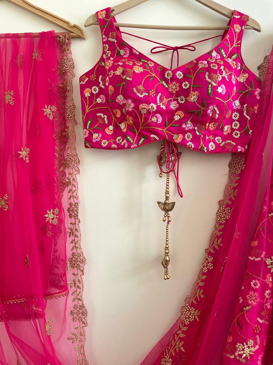 Work: Heavy floral thread work (Blouse/Lehenga), intricate floral embroidery (all over), delicate gold floral embroidery (Dupatta), scalloped border (Dupatta), back-tie detail with hanging latkans (Blouse), and tassel embellishments (Lehenga waist).