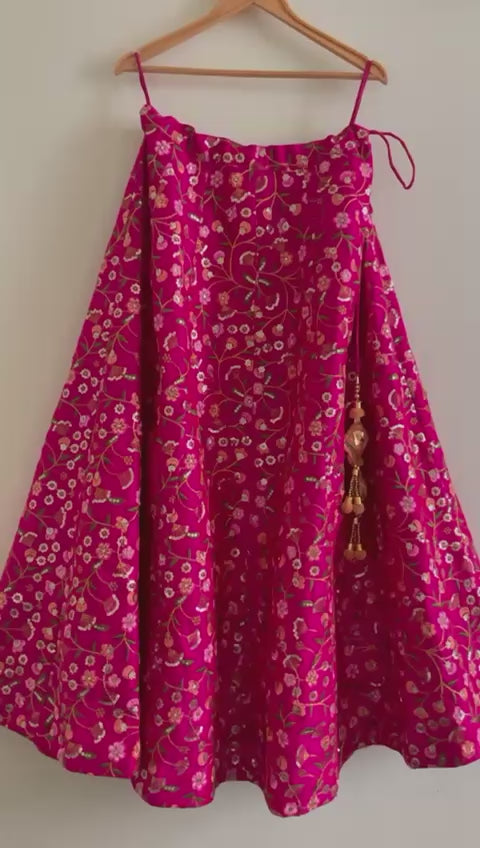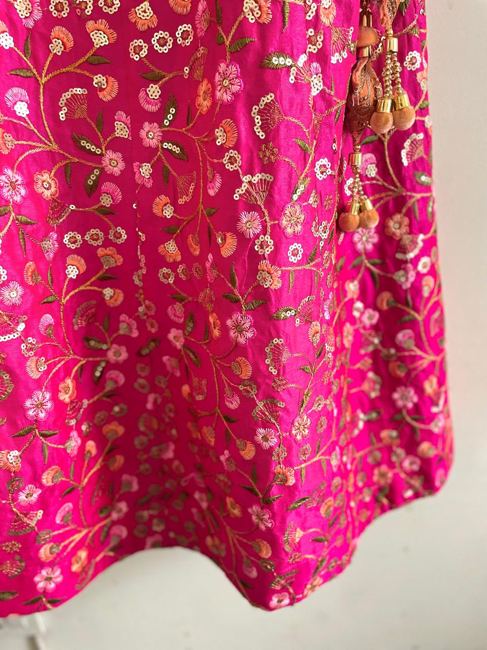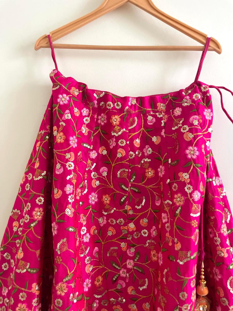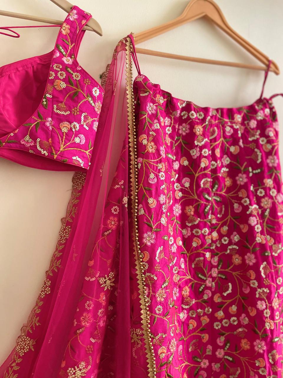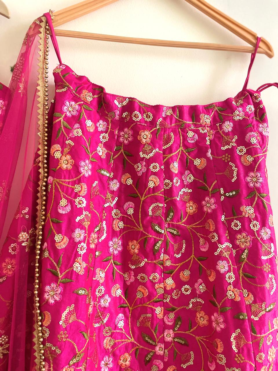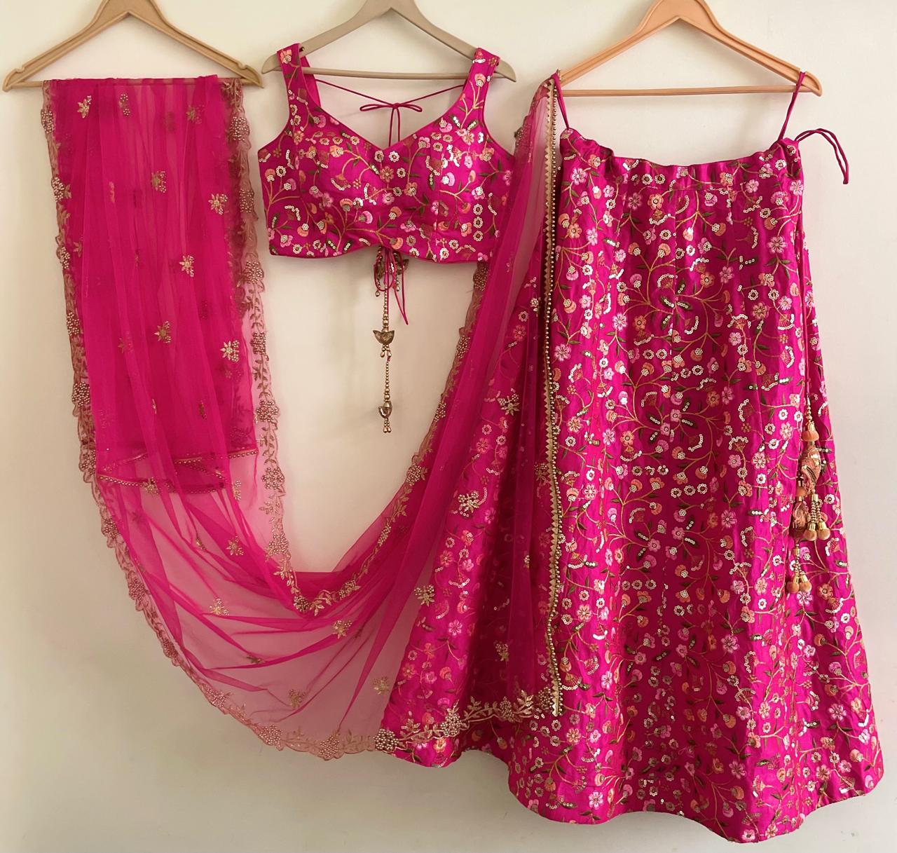 Work: Heavy floral thread work (Blouse/Lehenga), intricate floral embroidery (all over), delicate gold floral embroidery (Dupatta), scalloped border (Dupatta), back-tie detail with hanging latkans (Blouse), and tassel embellishments (Lehenga waist).
