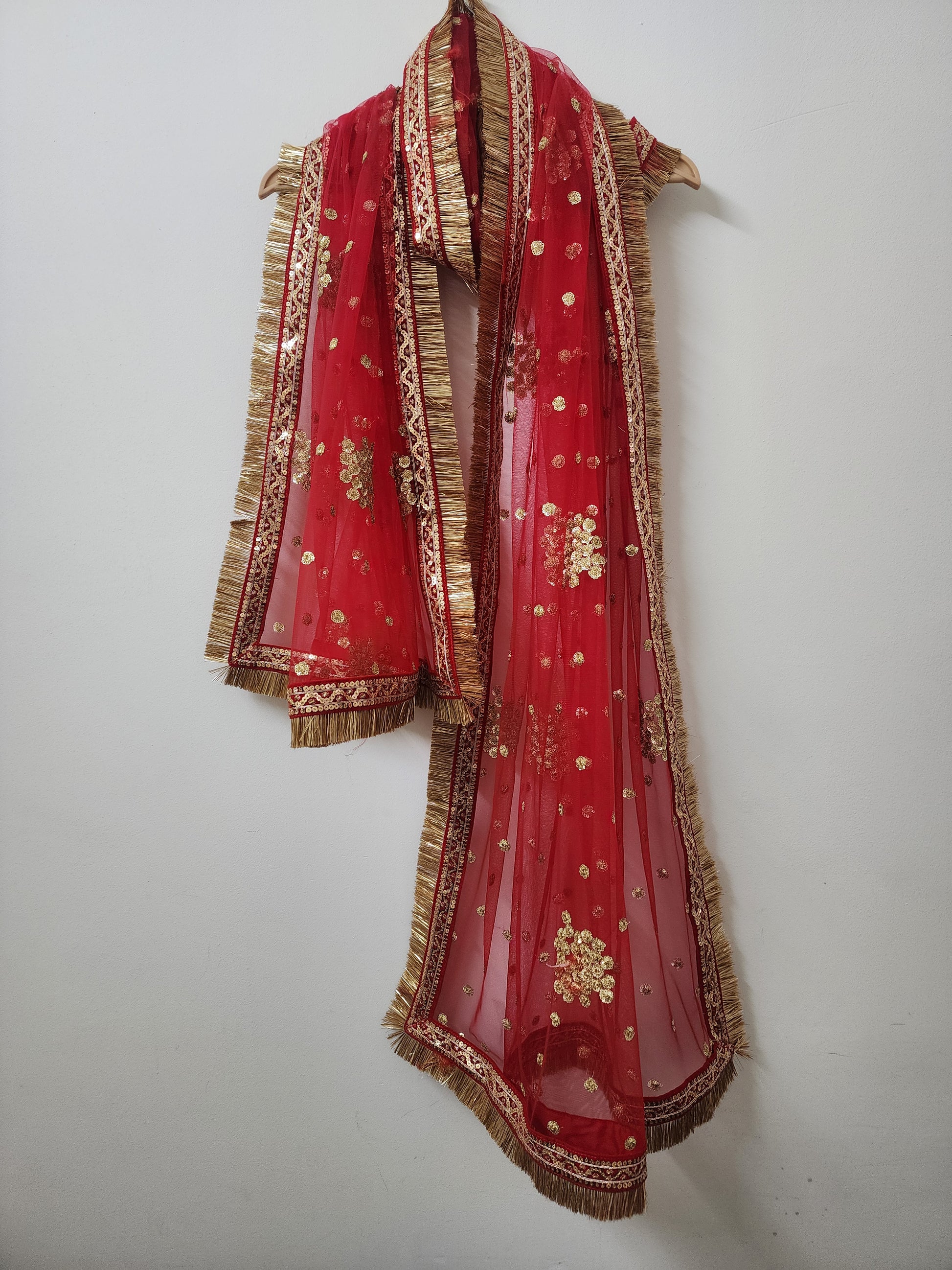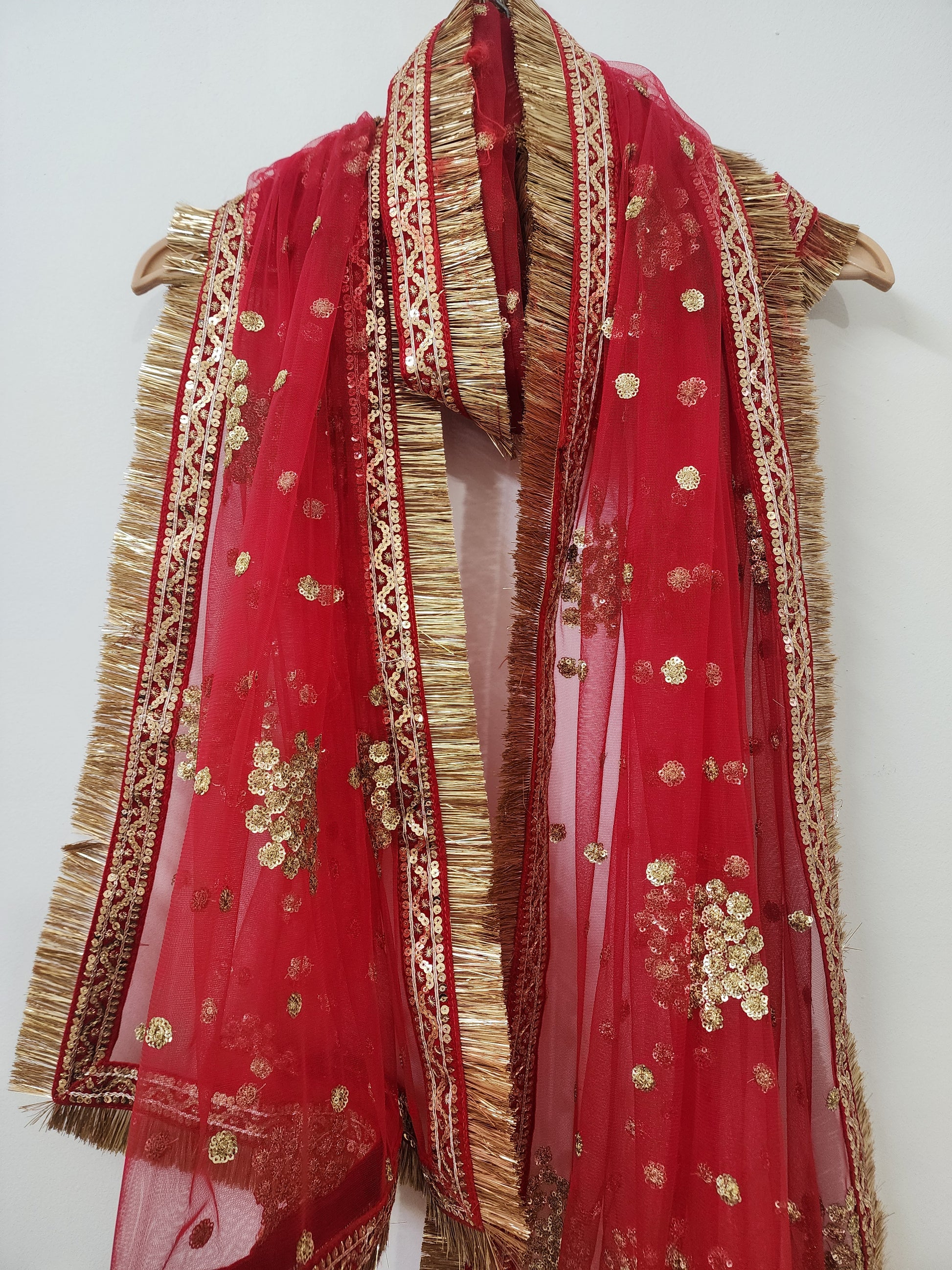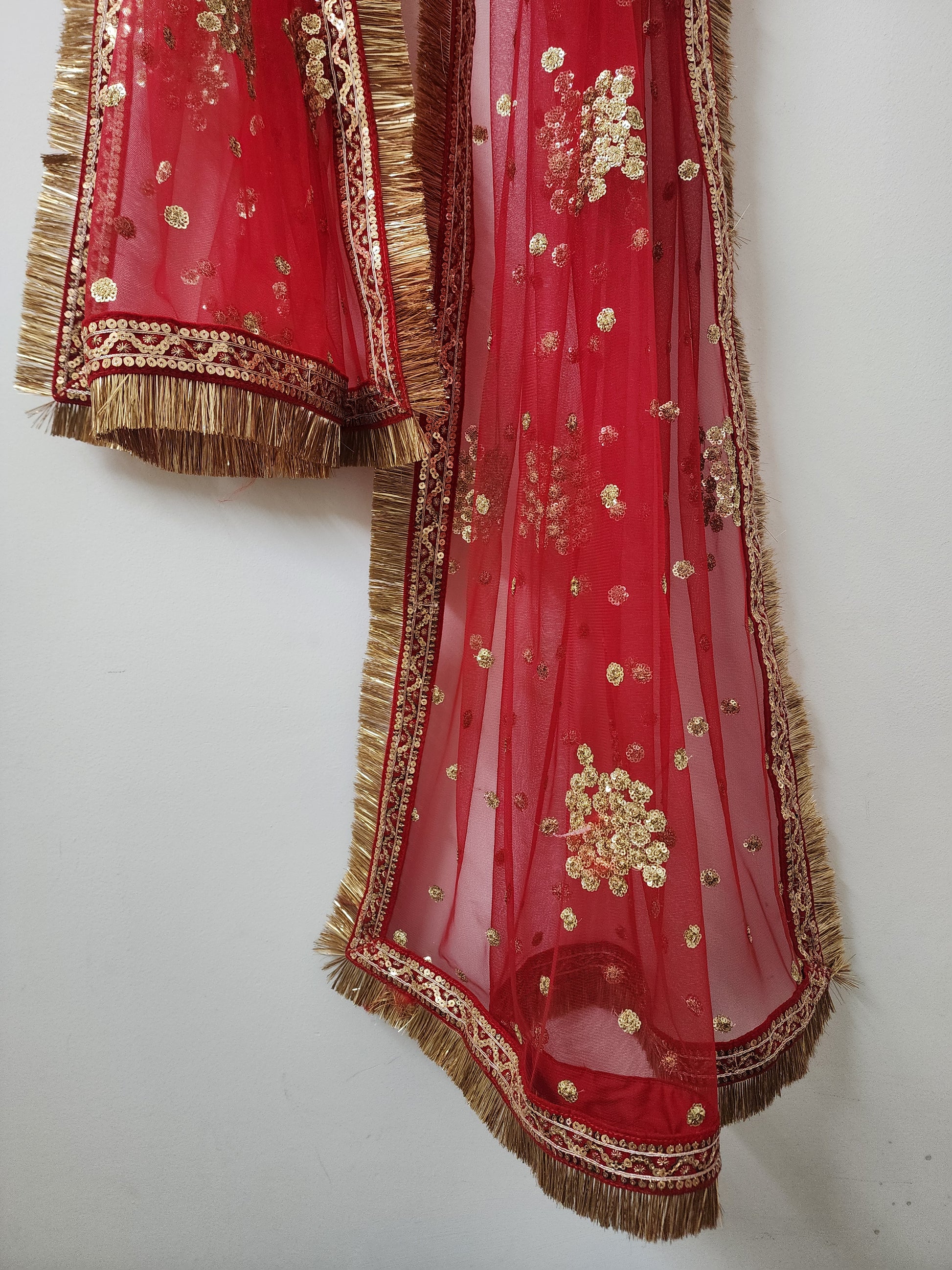 This red bridal dupatta is the perfect addition to any wedding outfit. Made from high-quality materials, it adds an elegant touch to any bridal look. Its vibrant color and intricate design will surely make you stand out on your special day. Elevate your bridal ensemble with this stunning dupatta.
