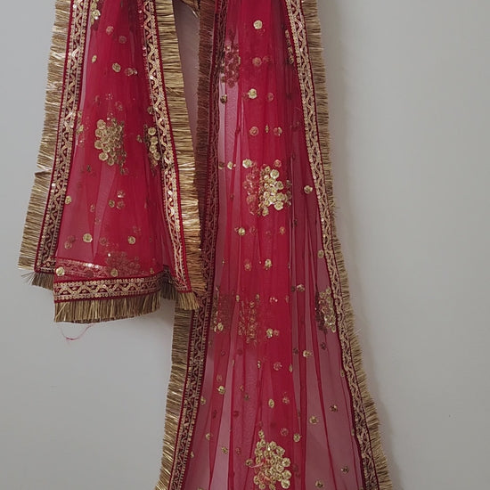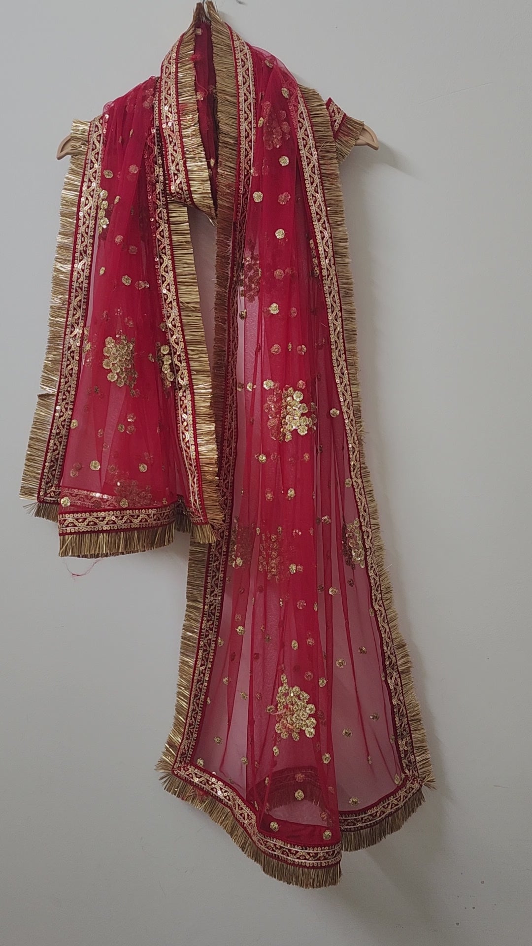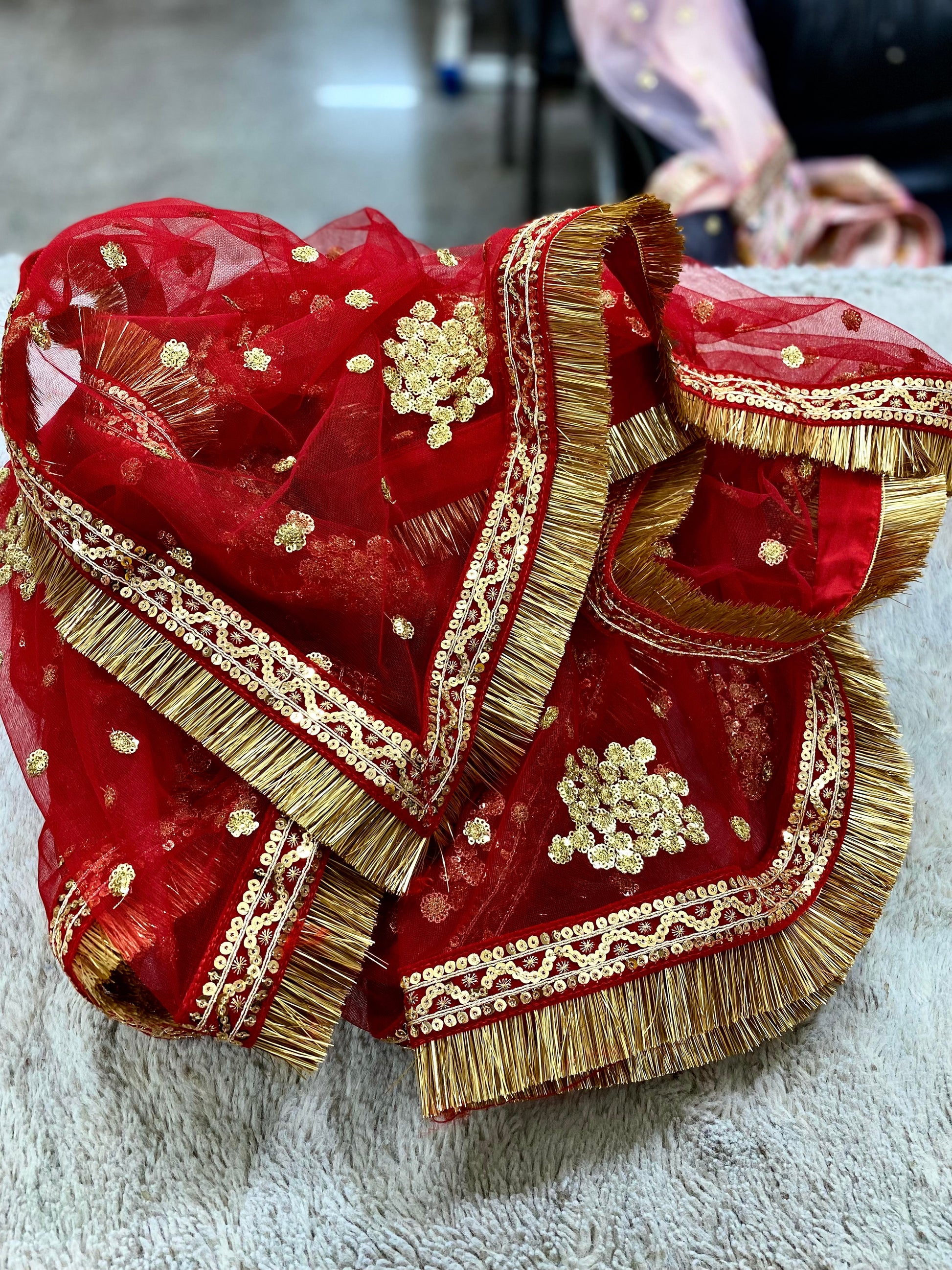 This red bridal dupatta is the perfect addition to any wedding outfit. Made from high-quality materials, it adds an elegant touch to any bridal look. Its vibrant color and intricate design will surely make you stand out on your special day. Elevate your bridal ensemble with this stunning dupatta.