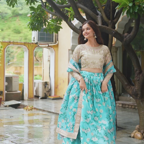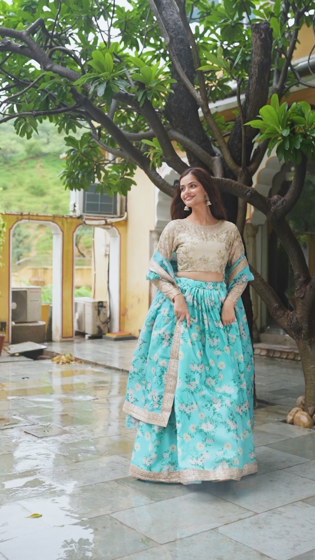 Sky Blue Floral Printed Lehenga Set with Embroidered Blouse