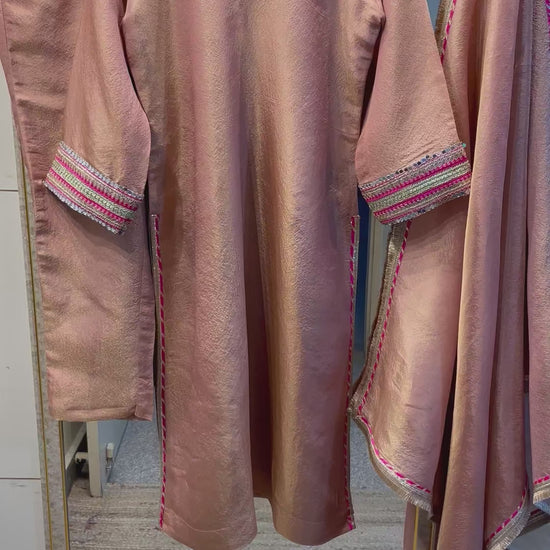Elevate your style with our elegant Tissue salwar suit. Hand-crafted by Indian designers, this custom stitched outfit showcases intricate details and a luxurious fabric. Perfect for formal occasions, this designer suit will make you stand out with its unique style and impeccable fit. Elevate your wardrobe with this statement piece today.