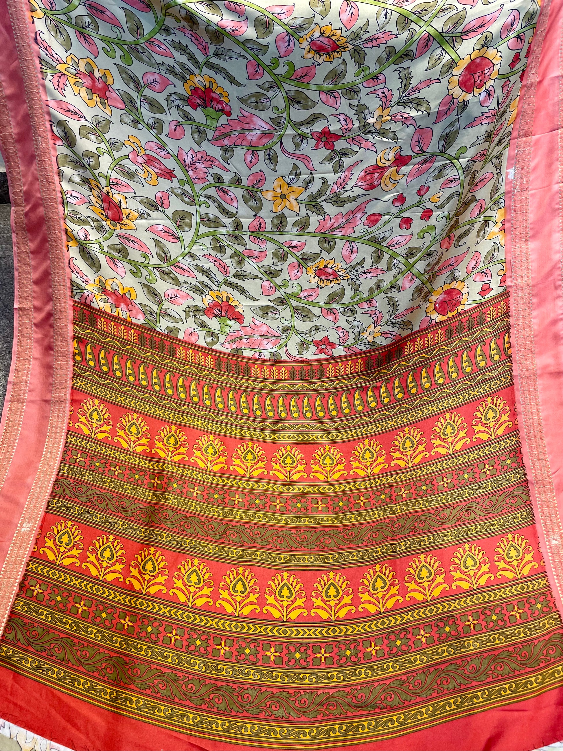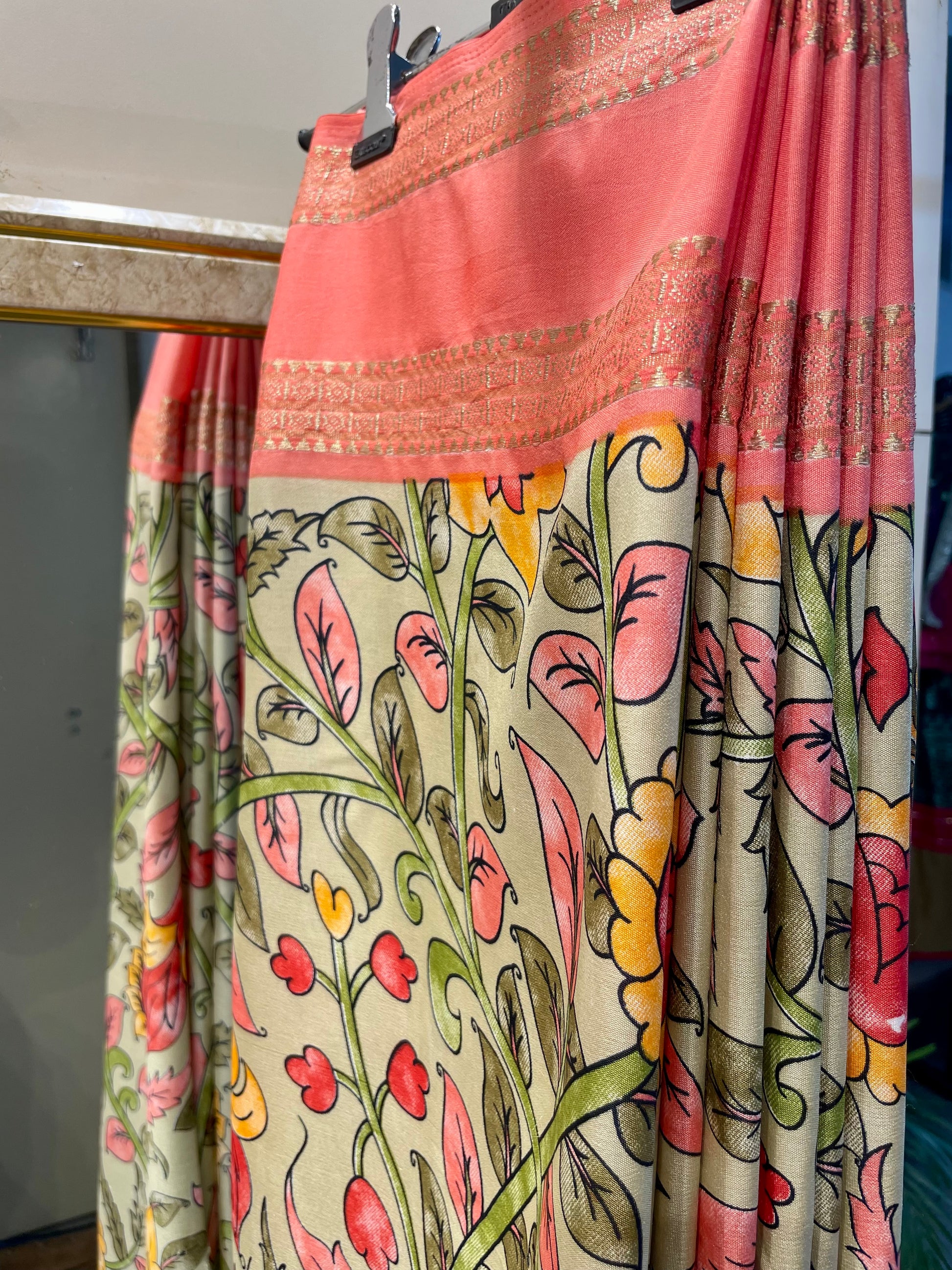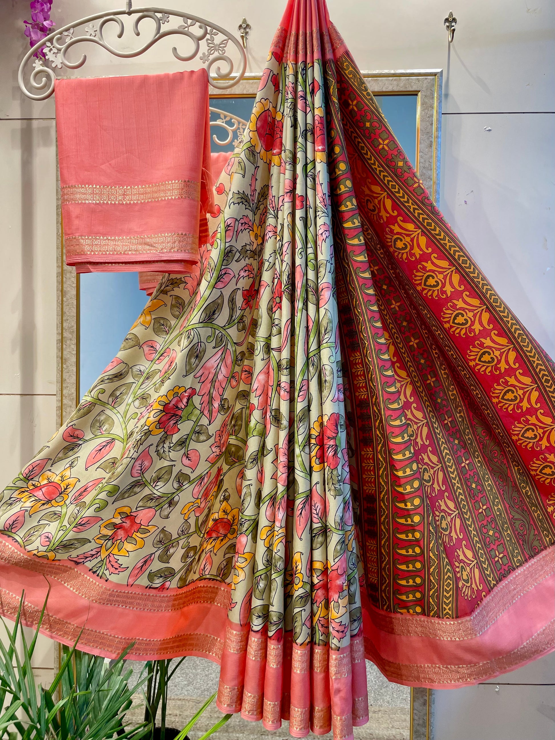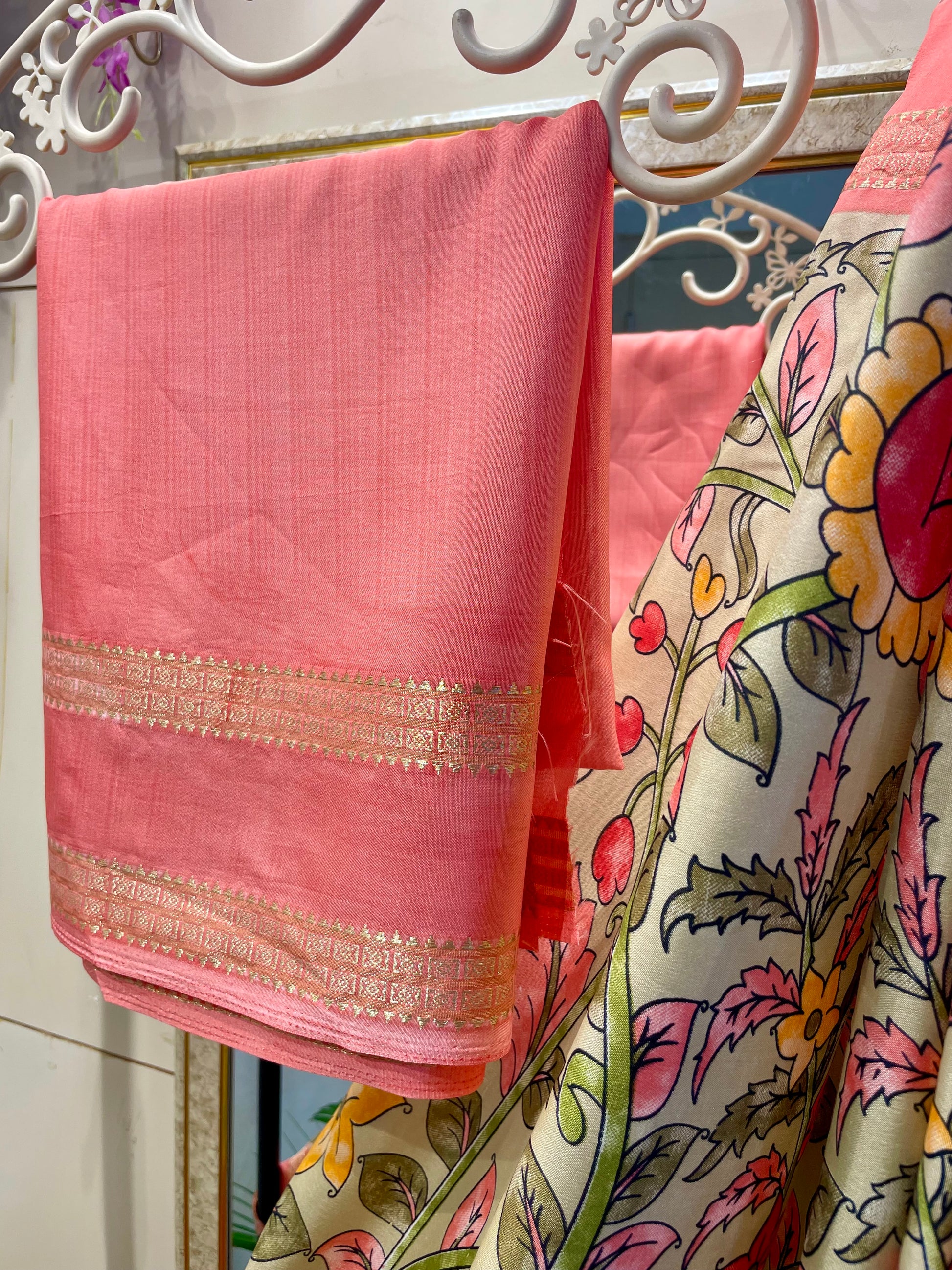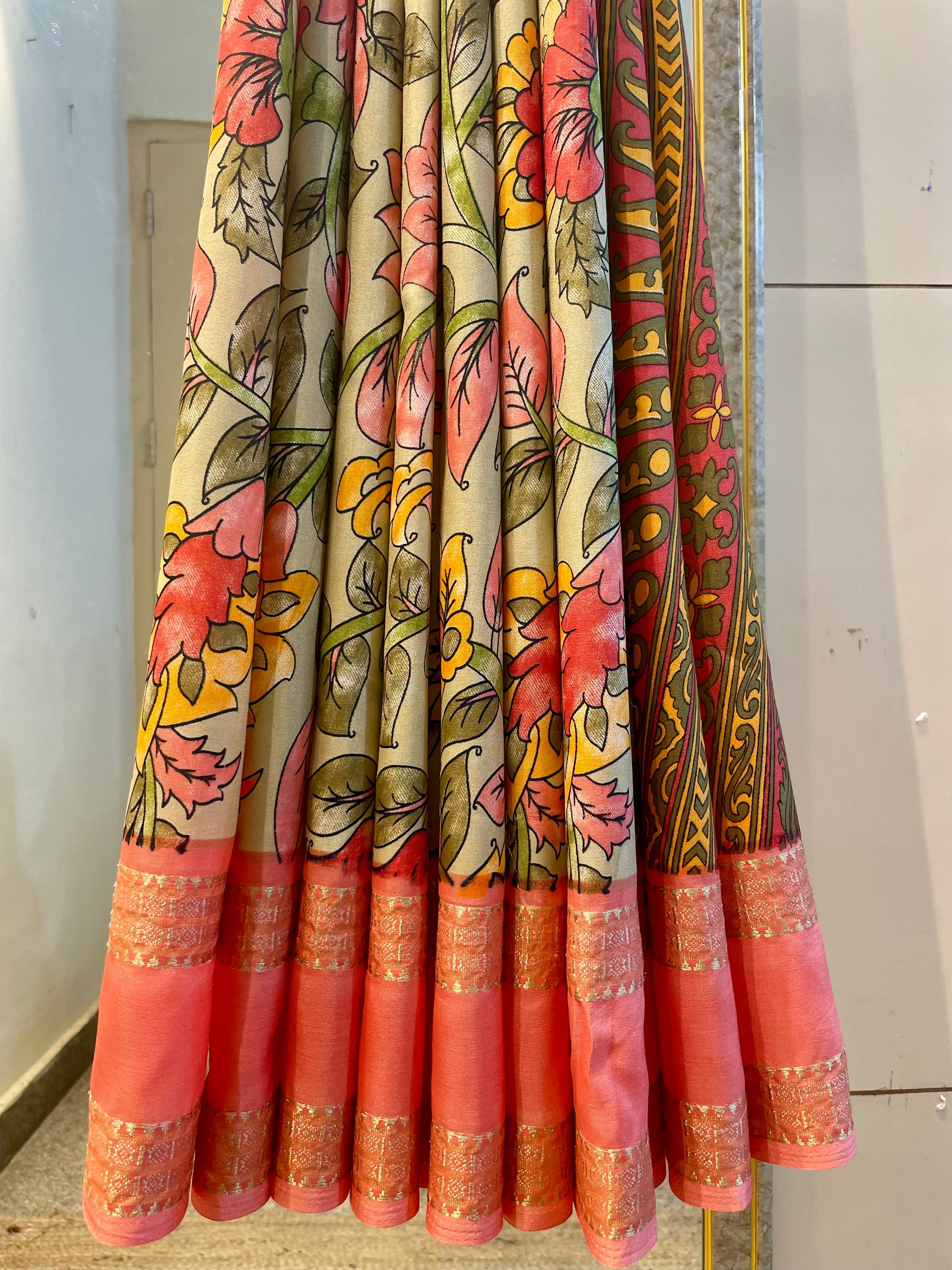 Expertly crafted from luxurious Tussar silk, this saree boasts an elegant pink blouse for a timeless and sophisticated look. Experience the softness and delicacy of this fabric, perfect for any special occasion. Indulge in the ultimate mix of style and comfort with this stunning saree.