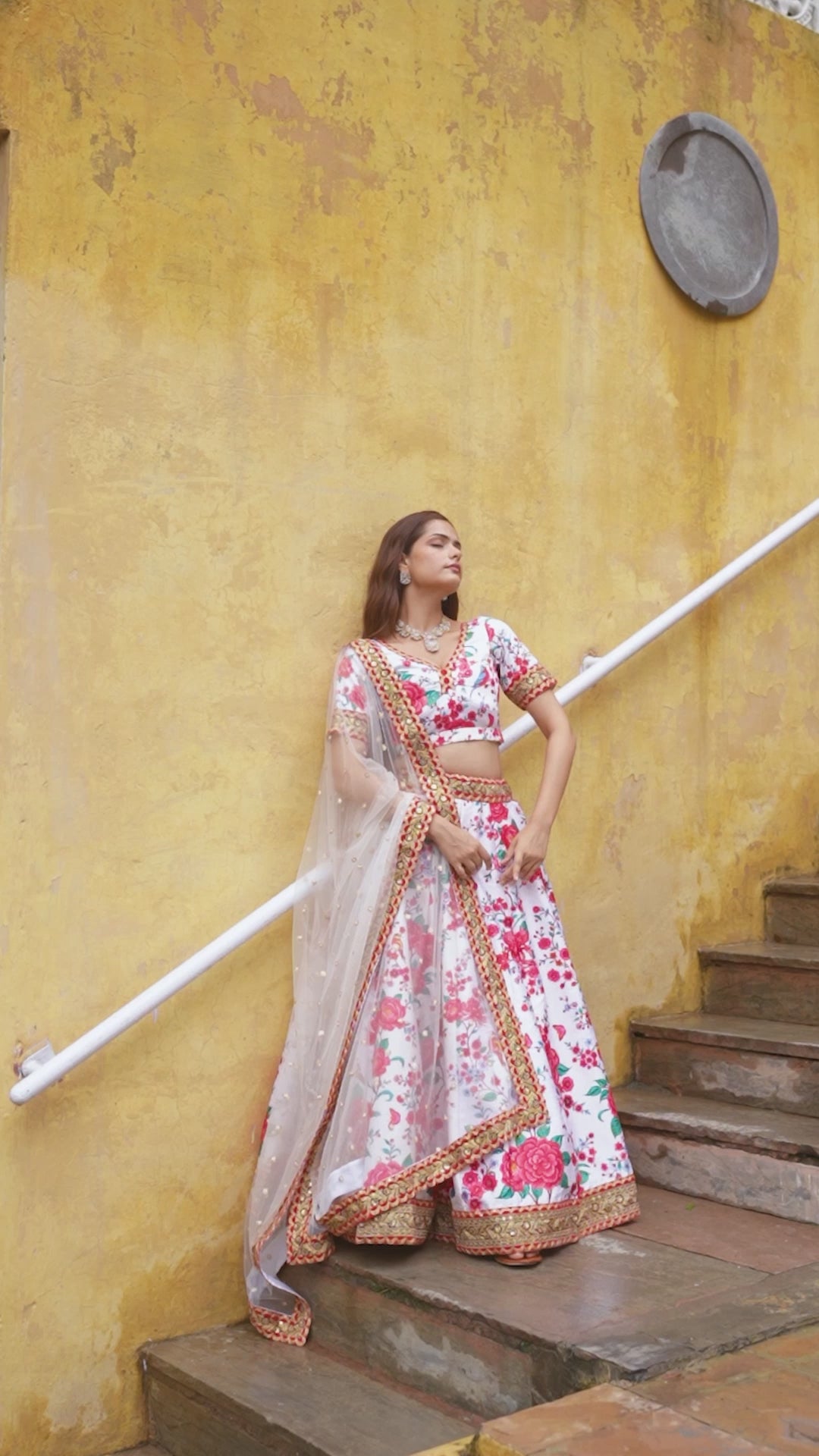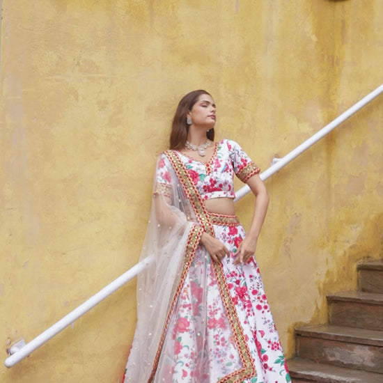 Bring freshness and elegance to your ethnic wardrobe with this stunning white lehenga set featuring vibrant floral prints and exquisite detailing. Perfect for festive occasions, this ensemble blends modern charm with traditional aesthetics effortlessly.
